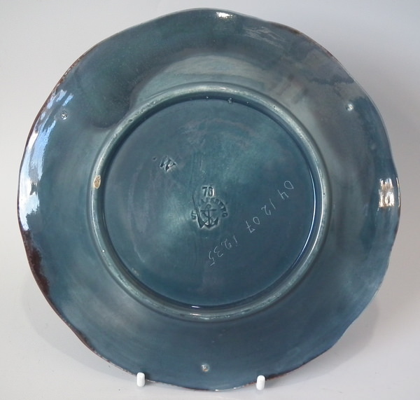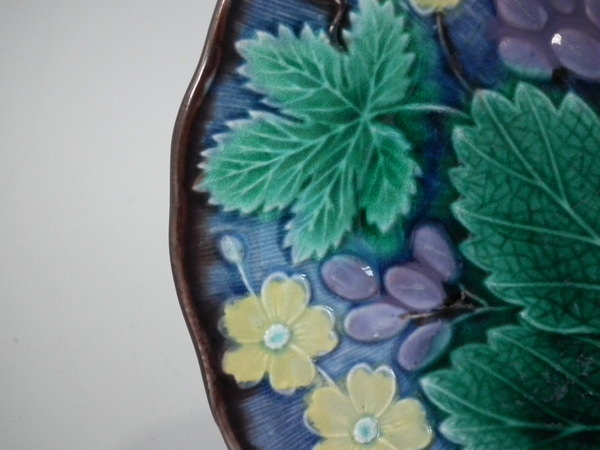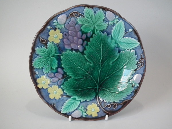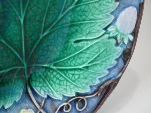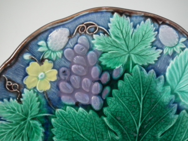 Victorian, circa 1870. 7.1ins high, 7.1ins wide, 0.8ins depth. Gustafsberg Majolica plate which features strawberries, leaves, grapes and blossoms.