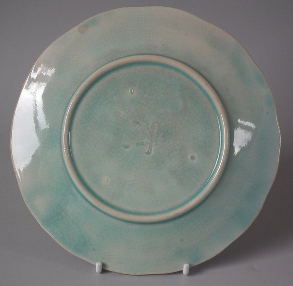 Victorian, circa 1898. 7.1ins high, 7.1ins wide, 0.8ins depth. Gustafsberg Majolica plate which features strawberries, leaves, grapes and blossoms. Colouration: cobalt blue, green, ochre, are predominant.