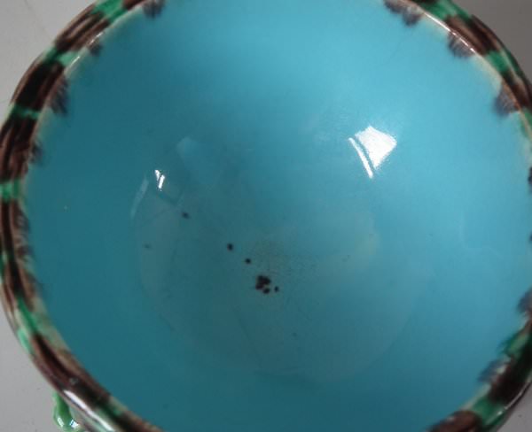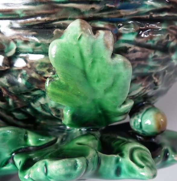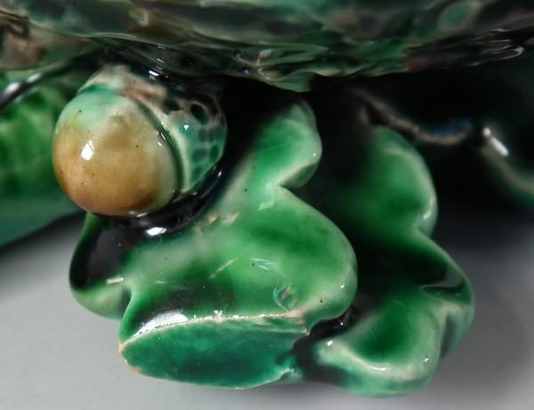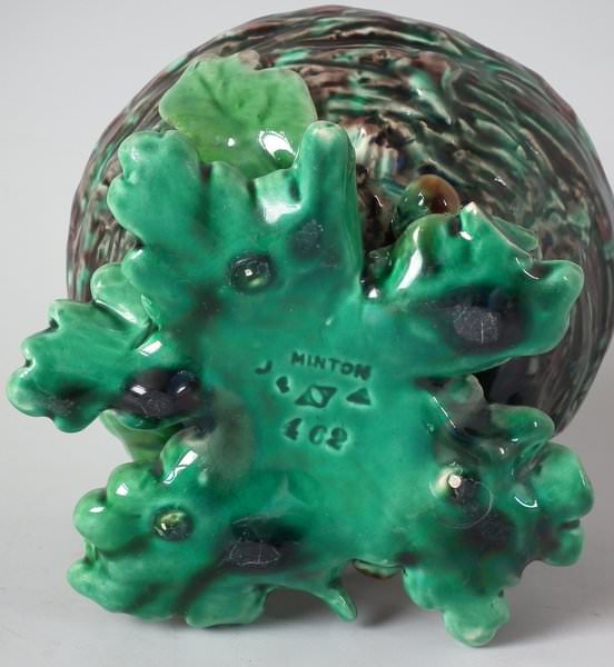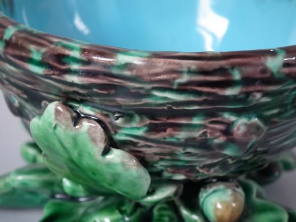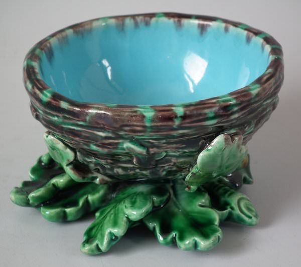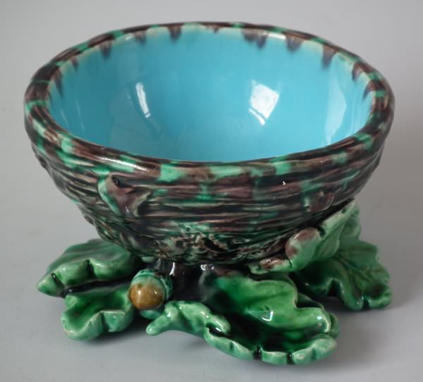 Victorian, circa 1863. 2.5ins high, 4.3ins wide, 4.3ins depth. Minton Majolica sweetmeat dish which features a nest supported by oak leaves and acorns. Colouration: turquoise, brown, green, are predominant.