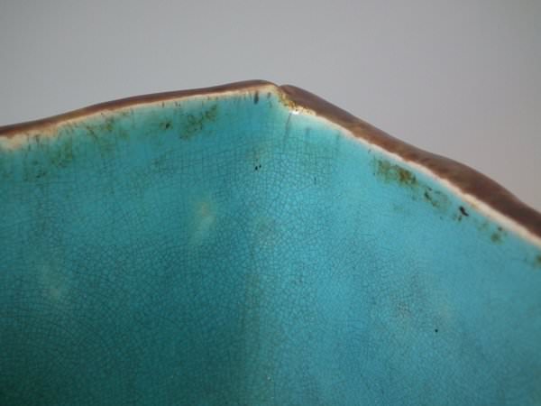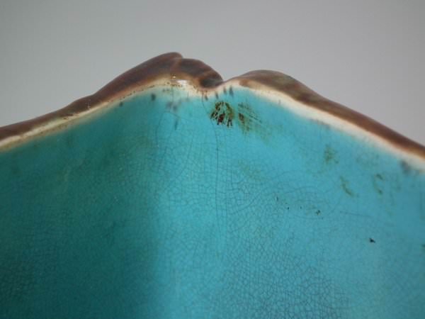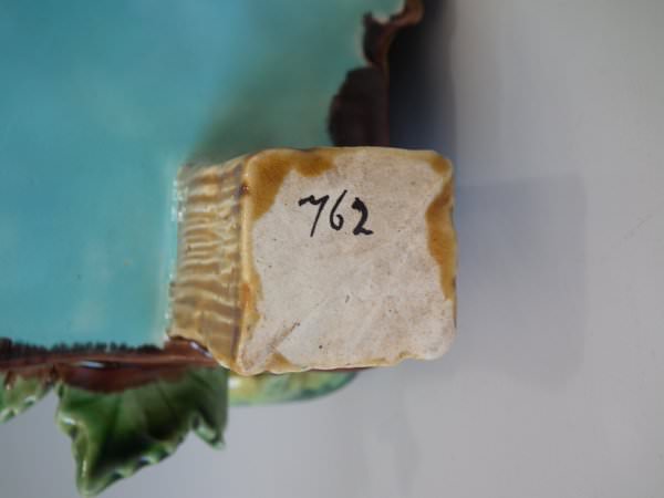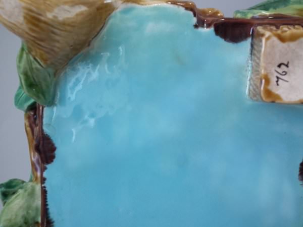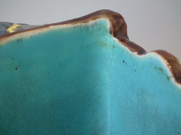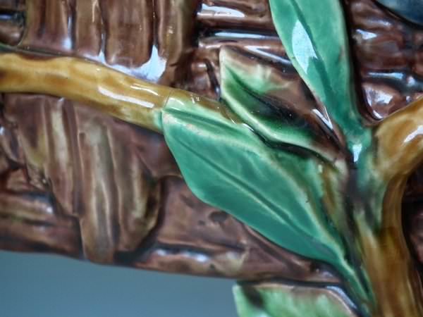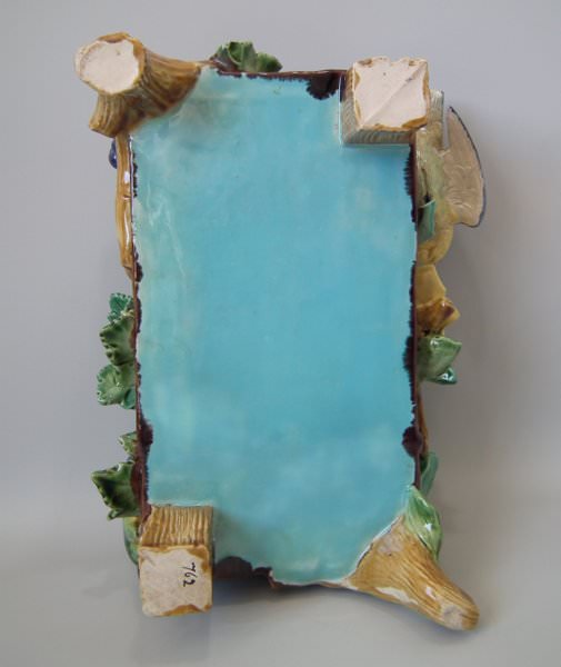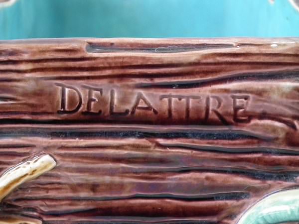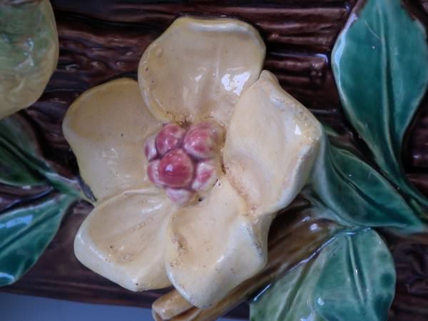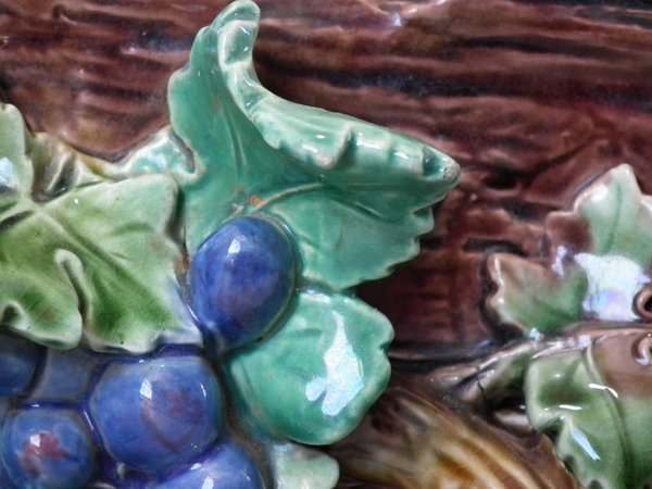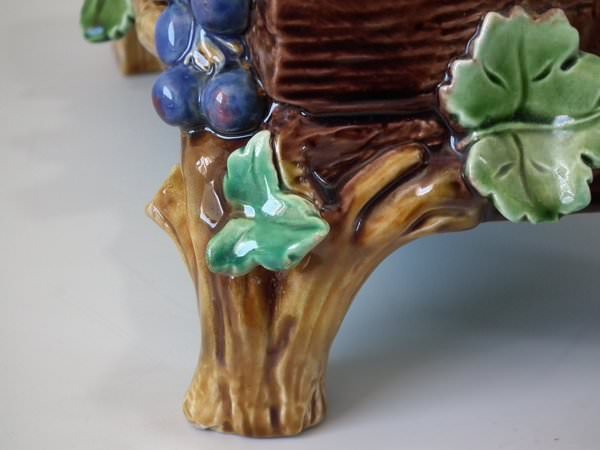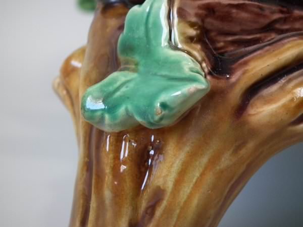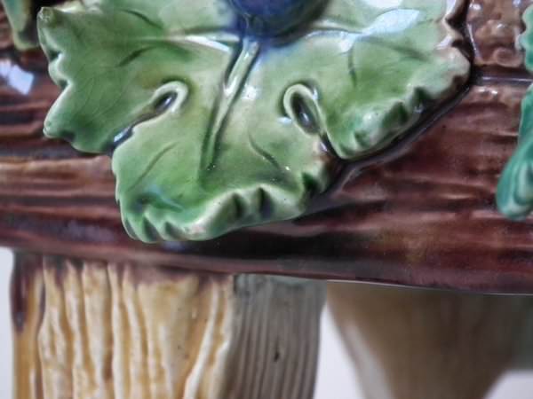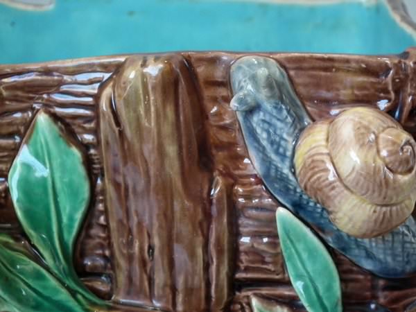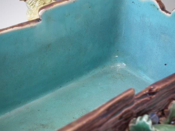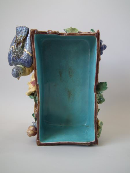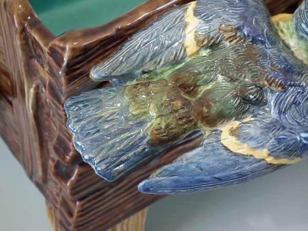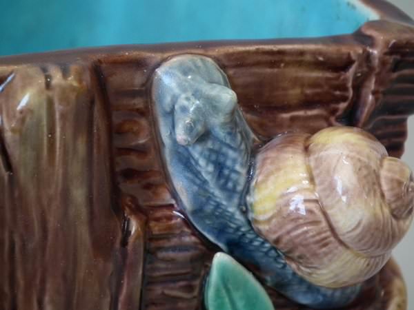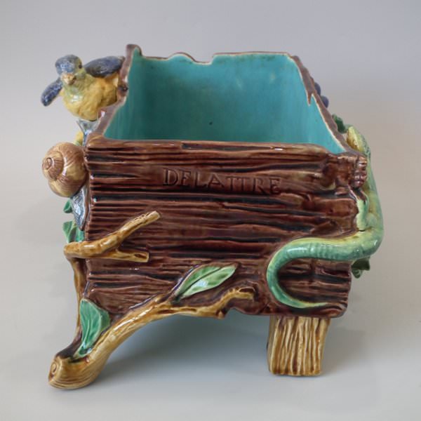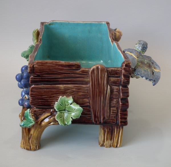 Brown Westhead Moore & Co Majolica planter which features a bird, snail and lizard around a wooden trough with vines and flowers around the outside.