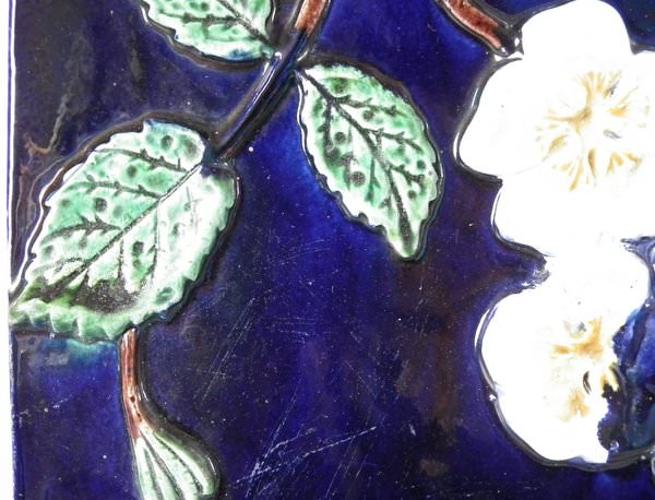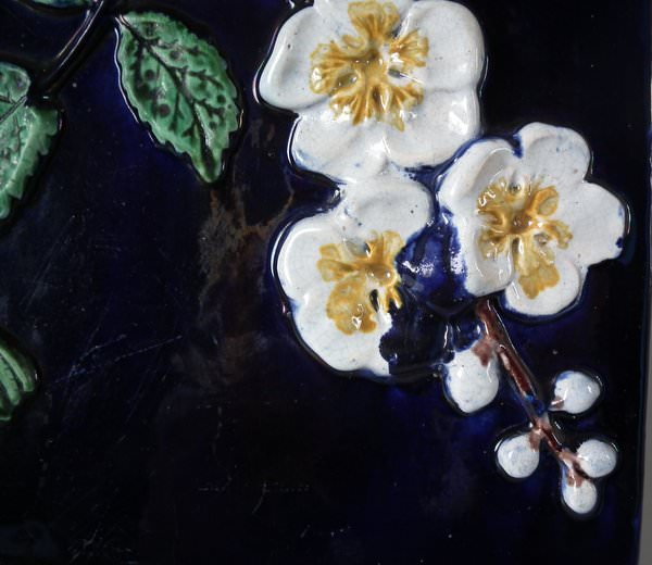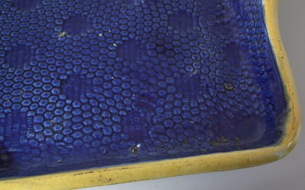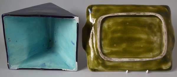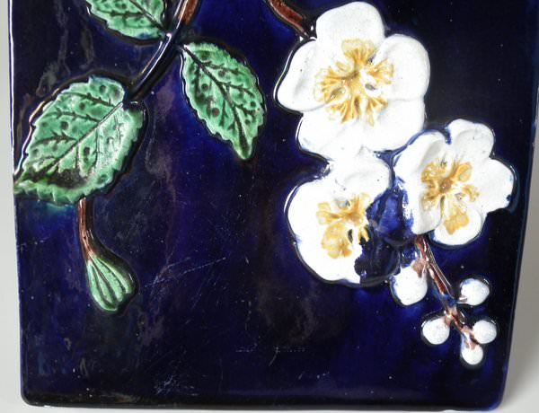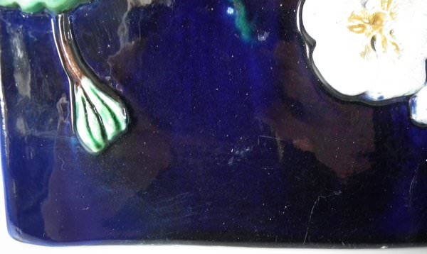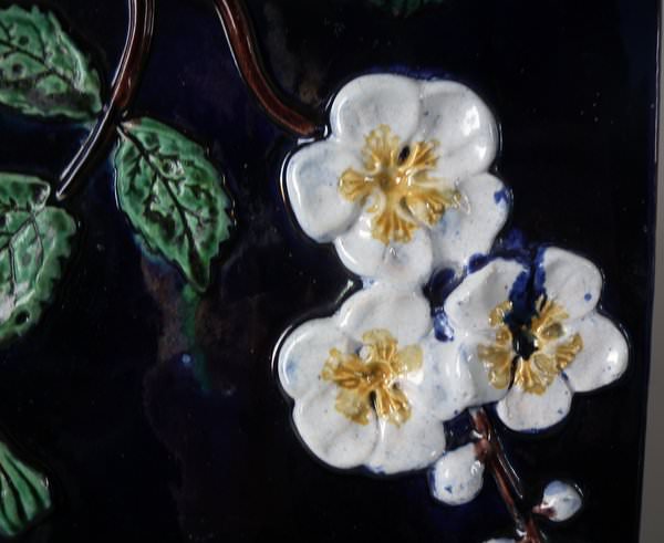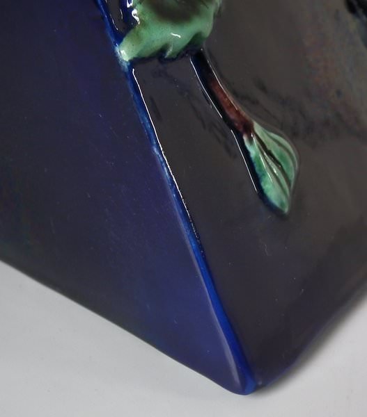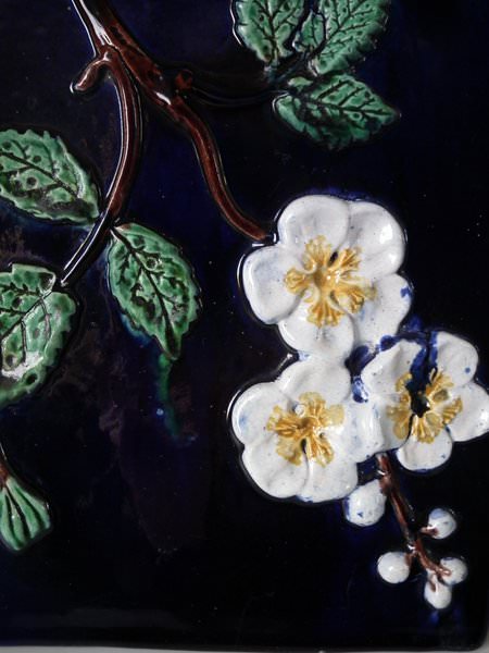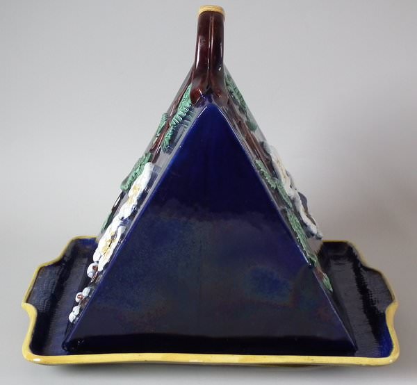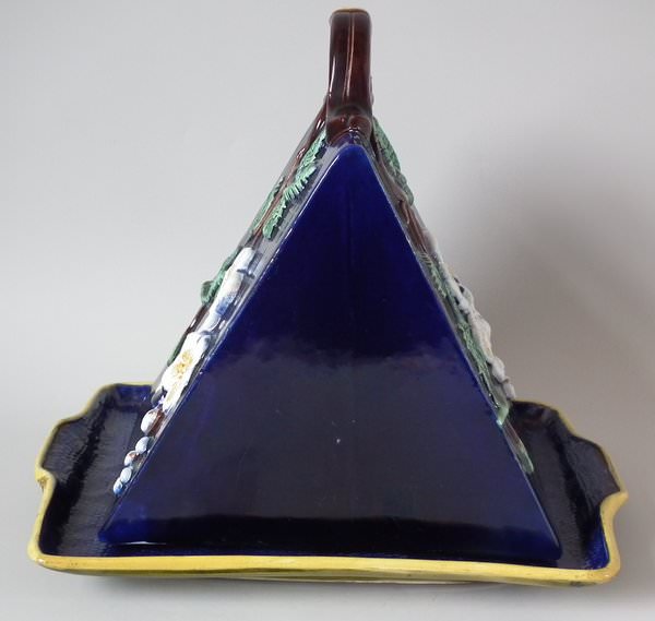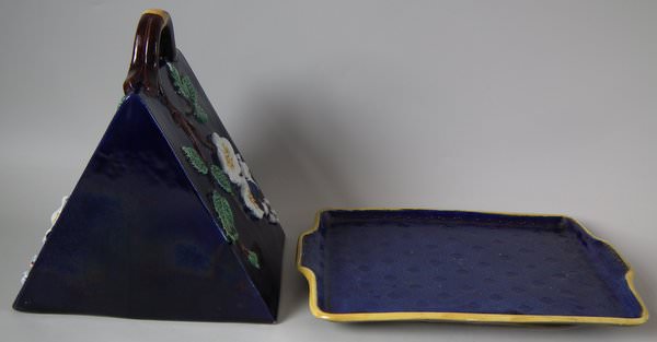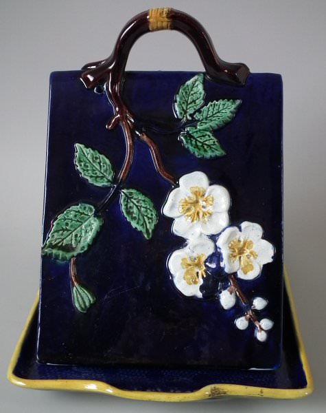 Victorian, circa 1870. 9.4ins high, 10.8ins wide, 7.6ins depth. Holdcroft Majolica cheese keep which features unusual wedge-shaped form, a branch handle and blossom to the sides. Cobalt blue ground version. Colouration: cobalt blue, white, brown, are predominant.
