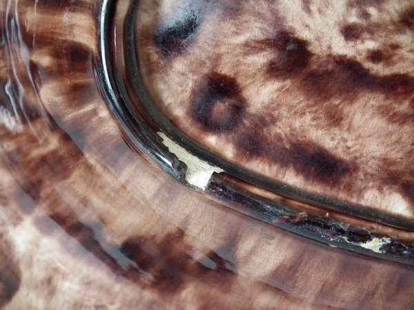 KILN EFFECTS: kiln detritus caught in the glaze to the rim.