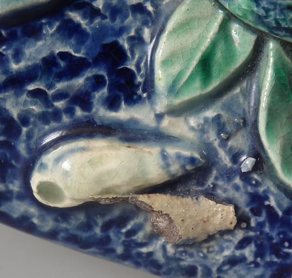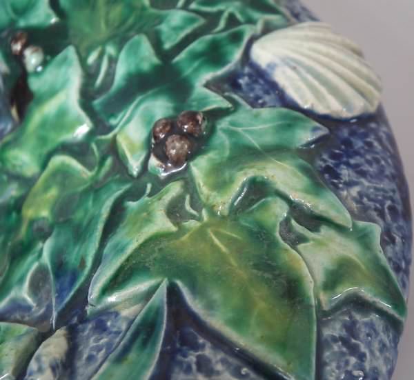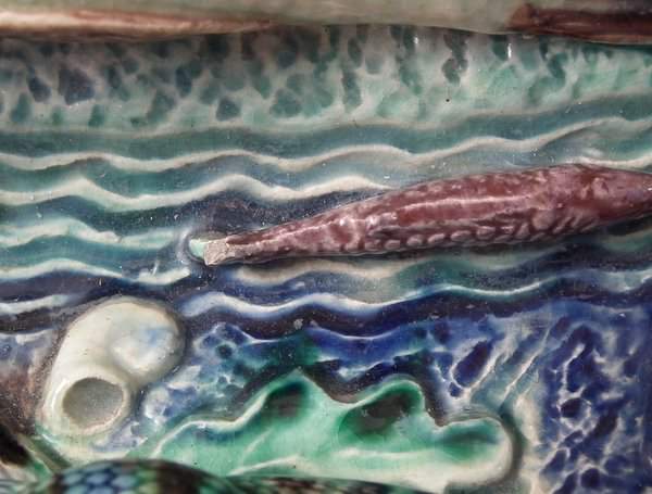 Victorian, circa 1890. 9.4ins high, 14ins wide, 2.4ins depth. French Palissy Majolica wall plate which features one large and two small fish, a snake, lizard, moths and shells. Colouration: blue, green, cream, are predominant.