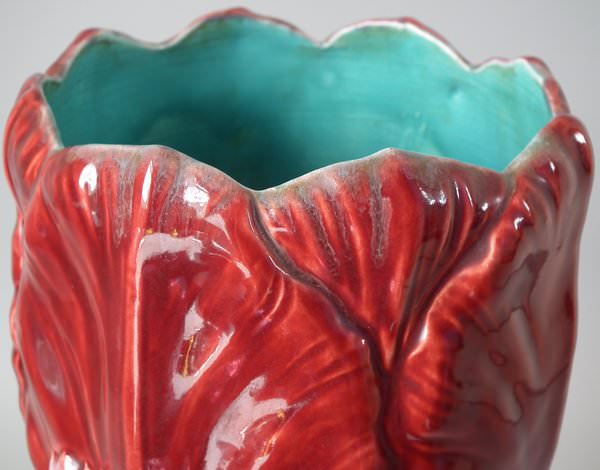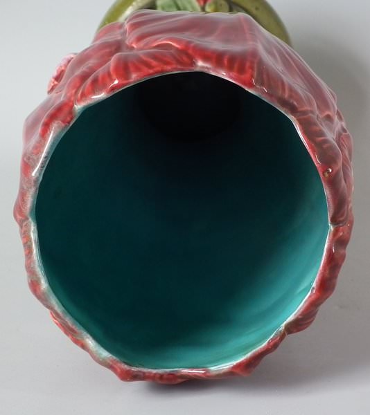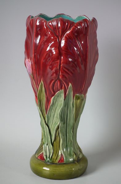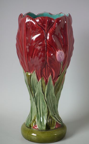 Victorian, circa 1900. 13.2ins high, 5.5ins wide, 5.5ins depth. Majolica vase which features one large and two small tulips with tulip leaves.