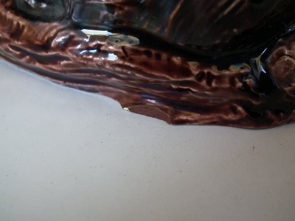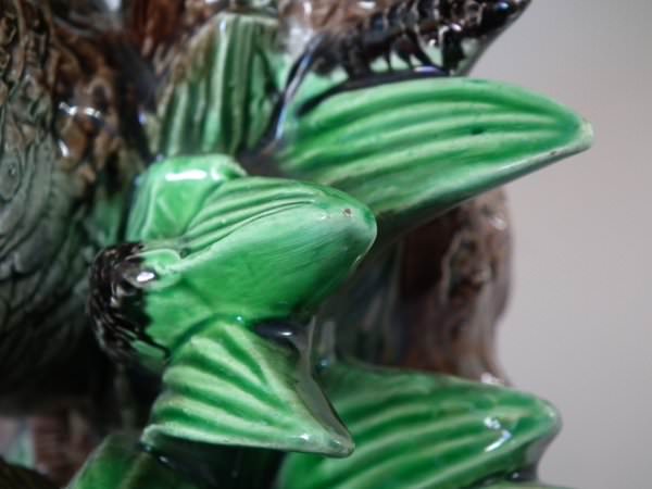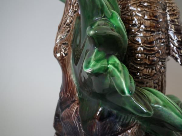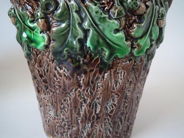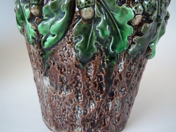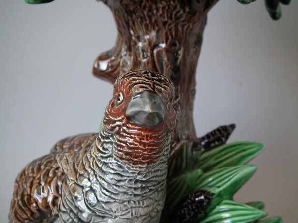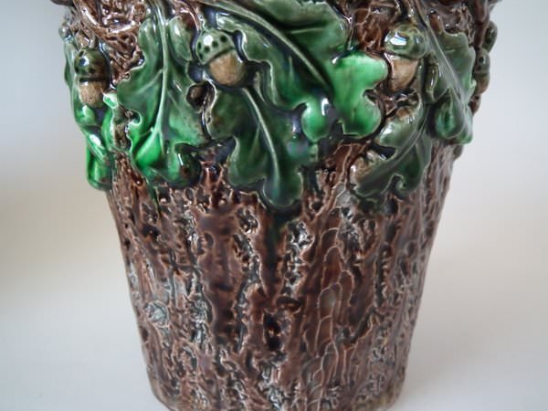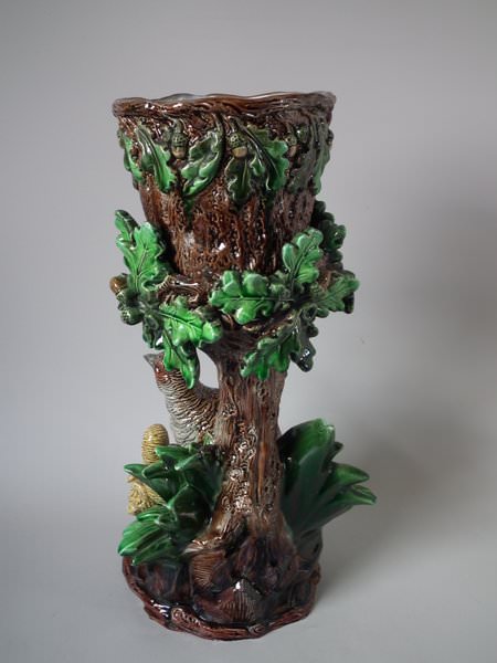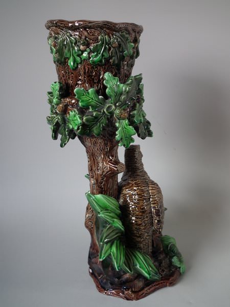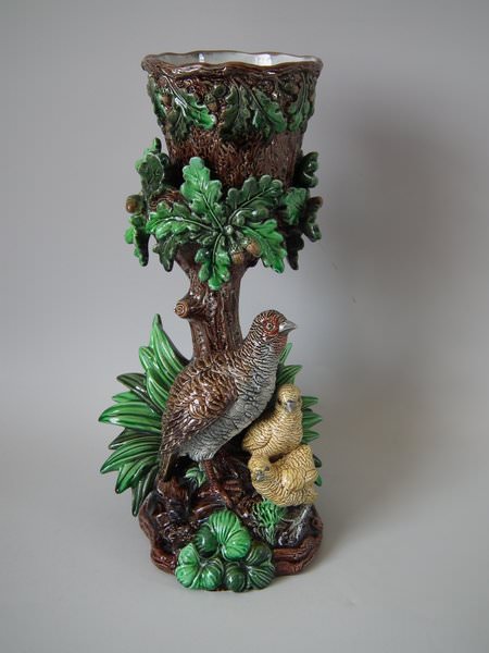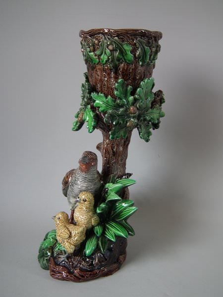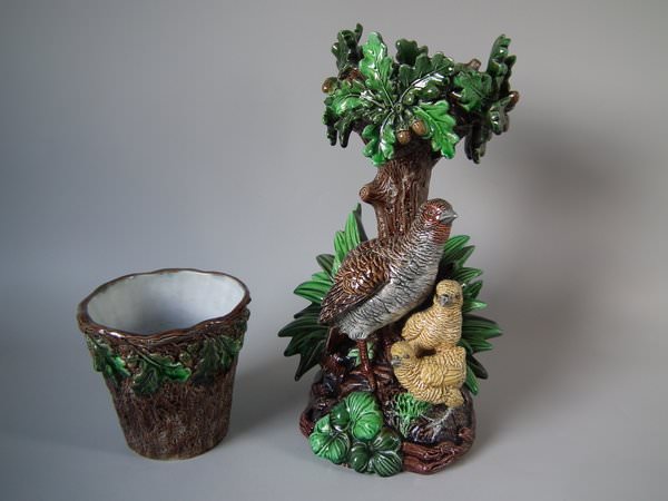 Victorian, circa 1880. 15ins high, 7.1ins wide, 5.9ins depth. Lonitz Majolica cache pot and stand which features a partridge and two chicks in front of an oak tree. Colouration: brown, green, ochre, are predominant.