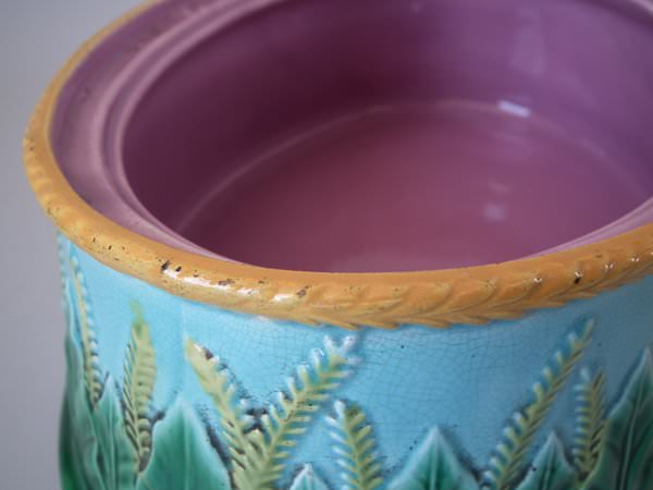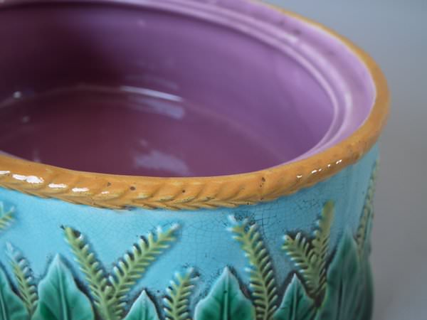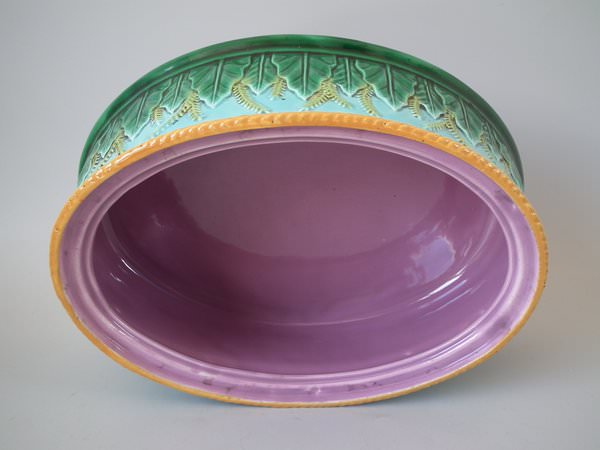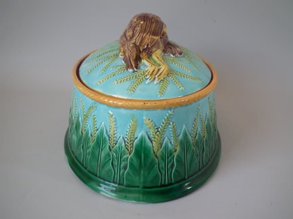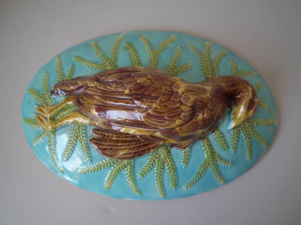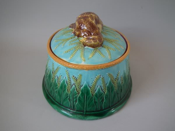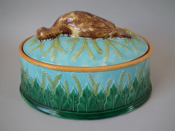Victorian, circa 1870. 6.3ins high, 11.8ins wide, 8.7ins depth. George Jones Majolica game pie dish which features a partridge on the cover