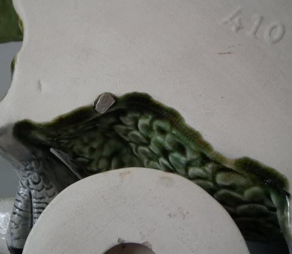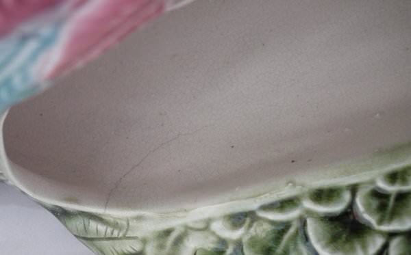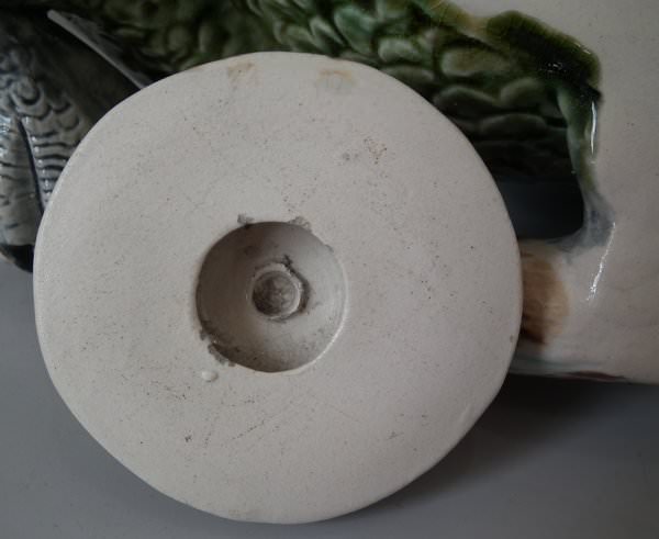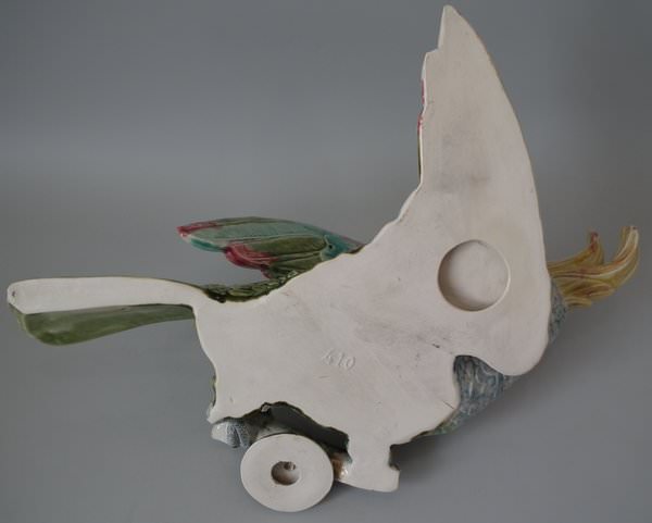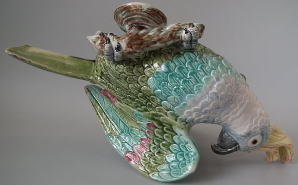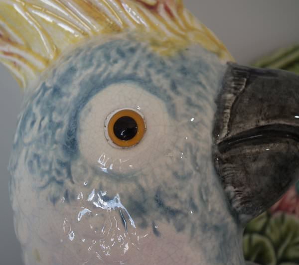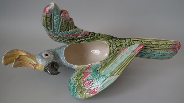Victorian, circa 1900. 13.1ins high, 17.6ins wide, 6.7ins depth. Majolica wall pocket which features a cockatoo perched on a branch. Colouration: green, blue, ochre, are predominant.