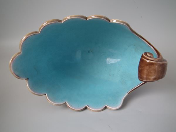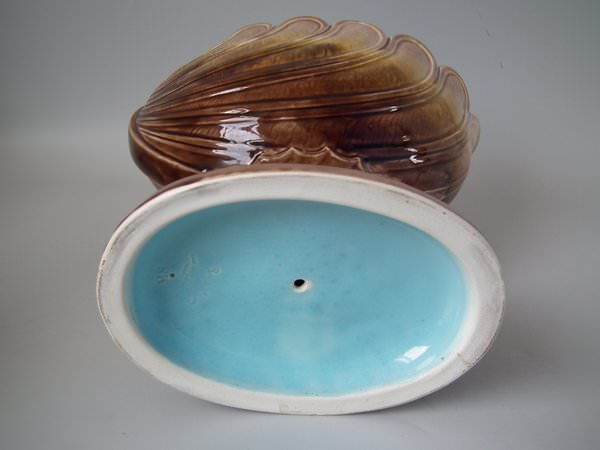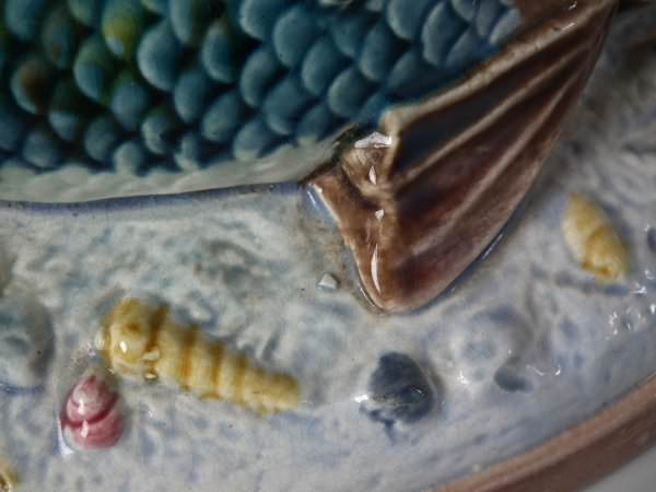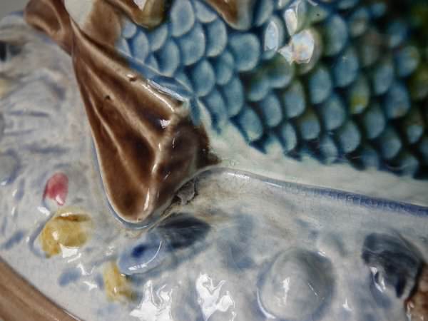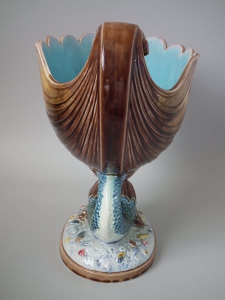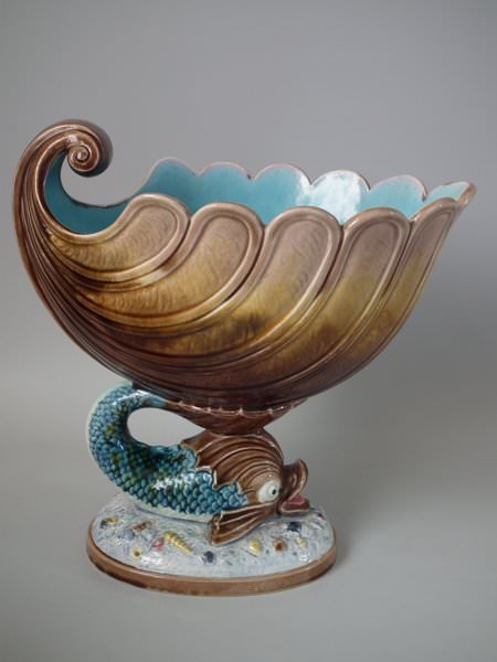 Victorian, circa 1900. 11.4ins high, 11.8ins wide, 7.1ins depth. Gustafsberg Majolica centrepiece bowl which features a fish supporting a shell.