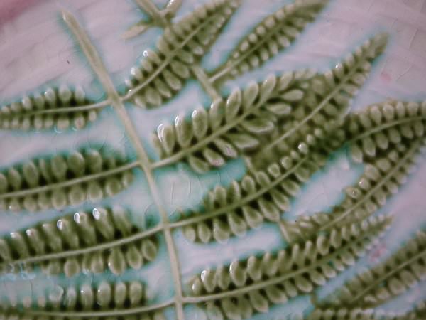 Sarreguemines Majolica plate which features two fern leaves on a basketweave ground.