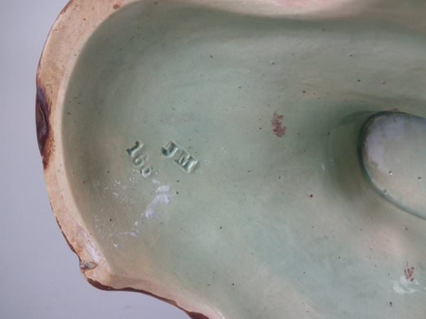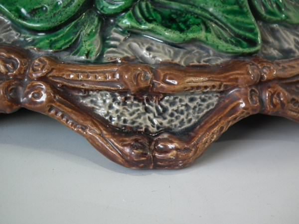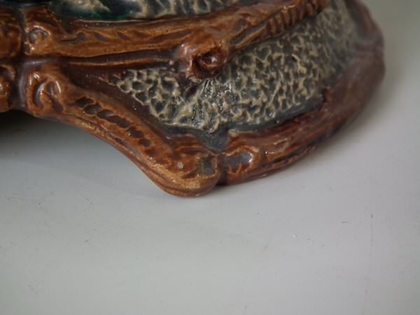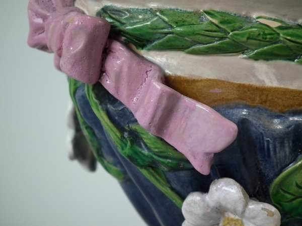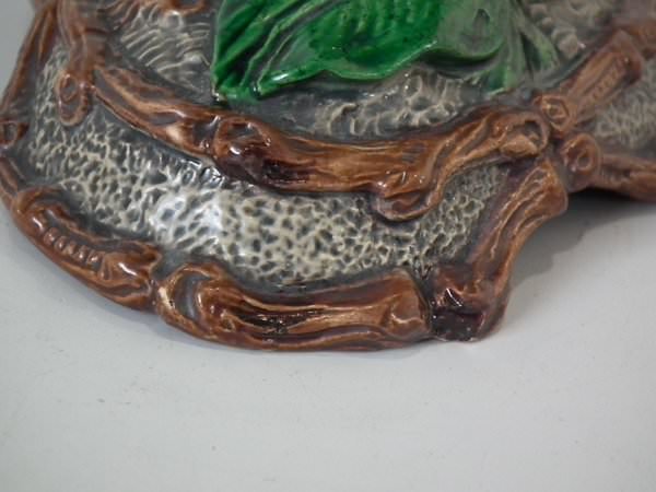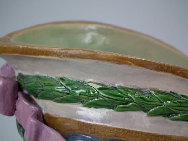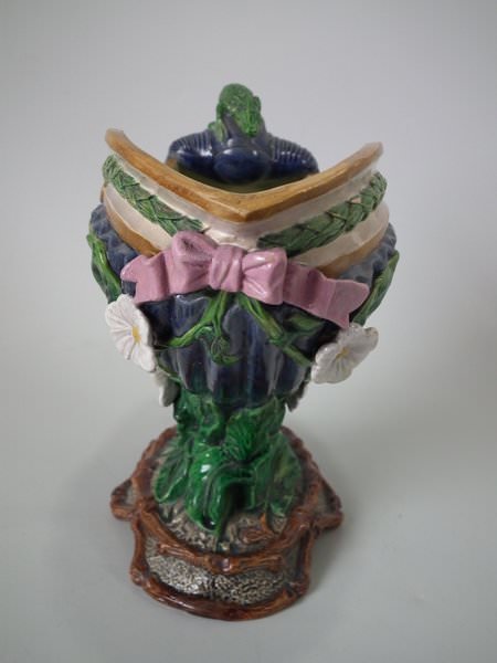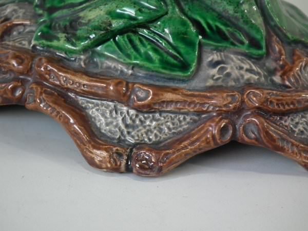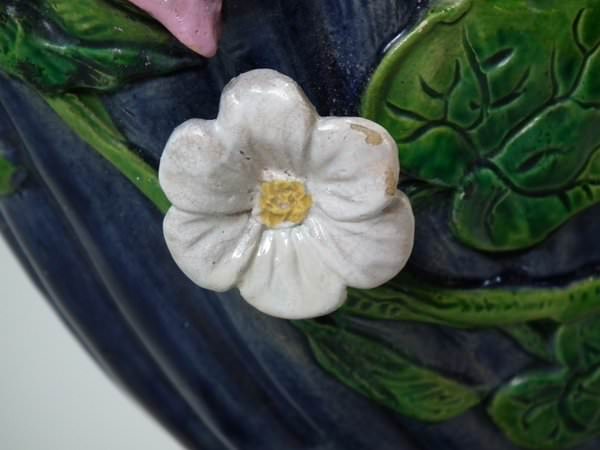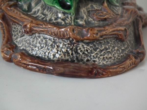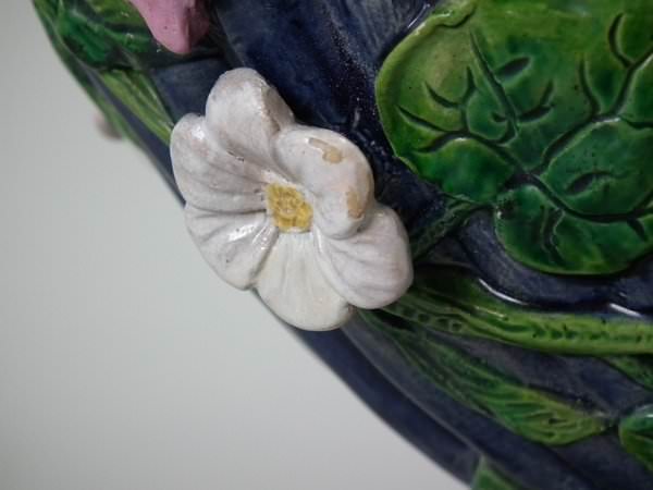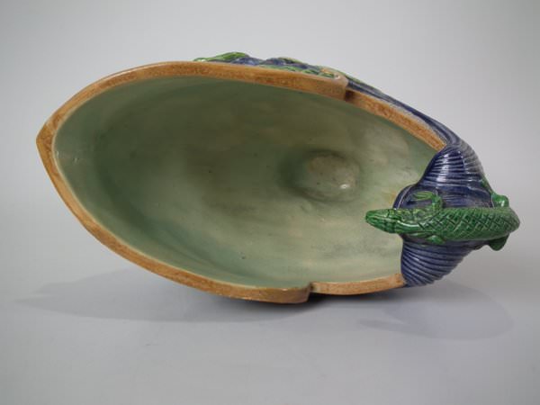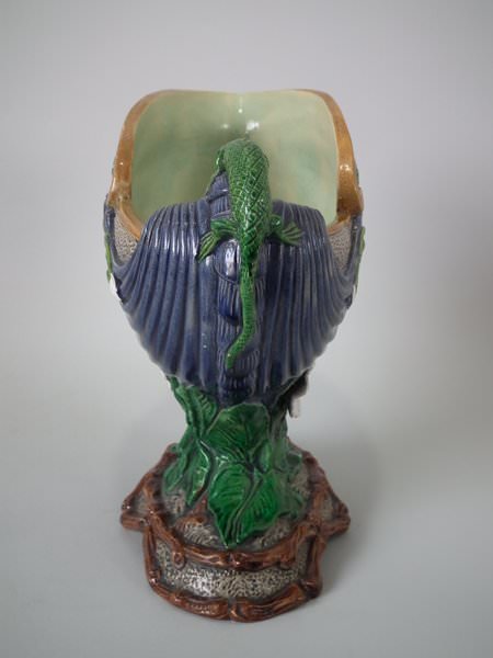 Majolica vase which features a flower and leaf encrusted shell, with a lizard on the handle.