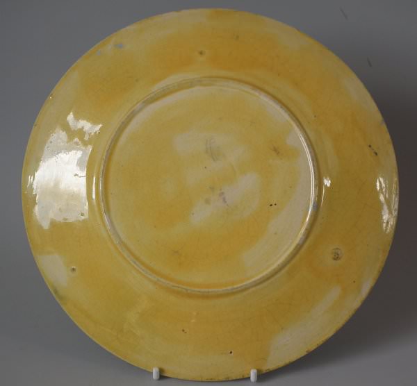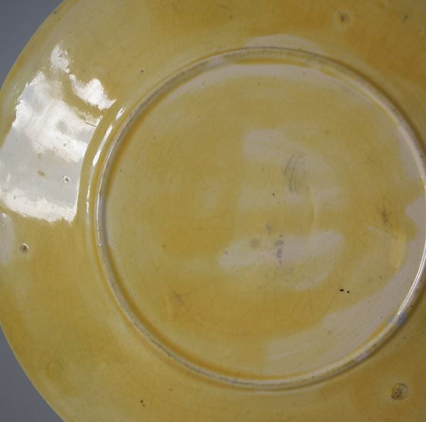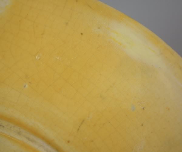 slight glaze run to the ochre glaze on inner rim;