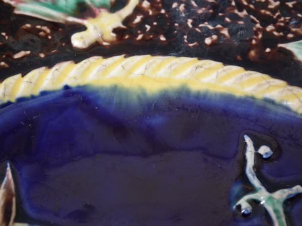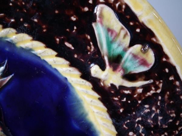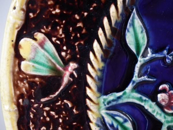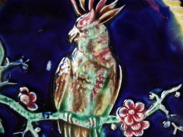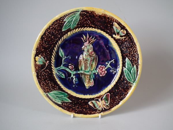 Victorian, circa 1880. 9ins high, 9ins wide, 0.8ins depth. Majolica plate which features a parrot perched on a branch. Colouration: cobalt blue, brown, ochre, are predominant.