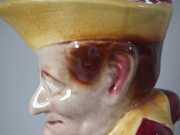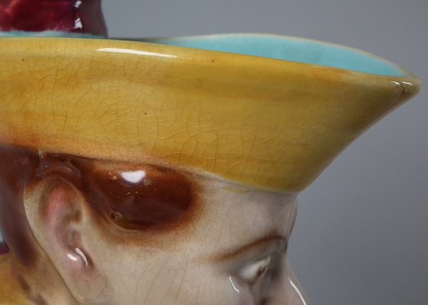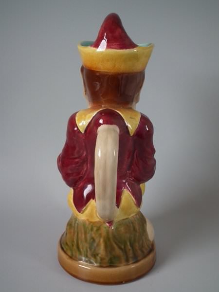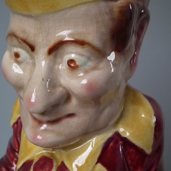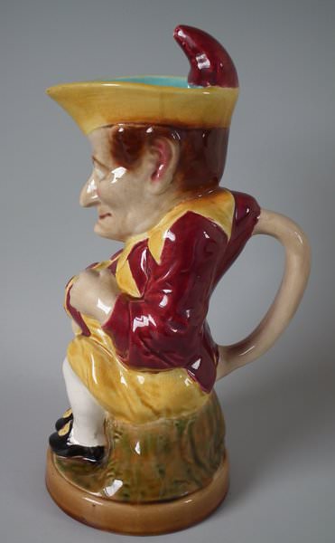 Victorian, circa 1890. 12.8ins high, 5.5ins wide, 7.5ins depth. Sarreguemines Majolica jug/pitcher which features a seated figure of Mr Punch. Colouration: dark pink, ochre, turquoise, are predominant.