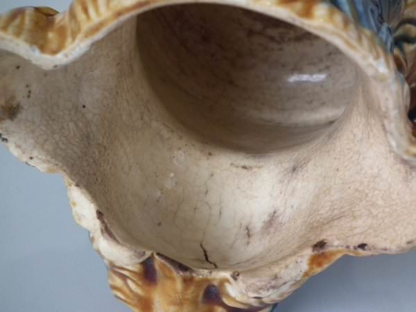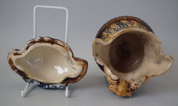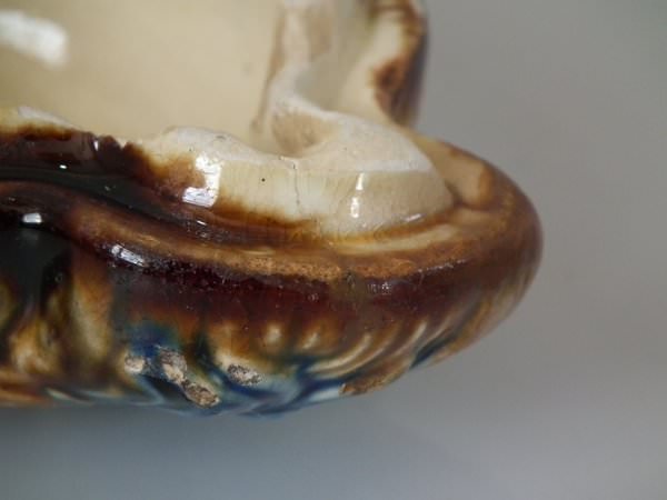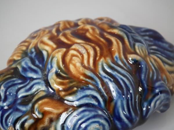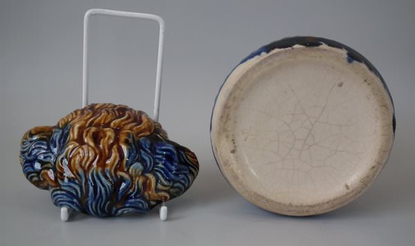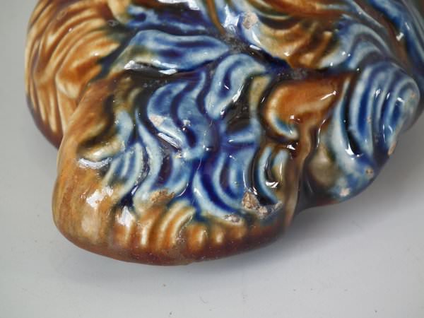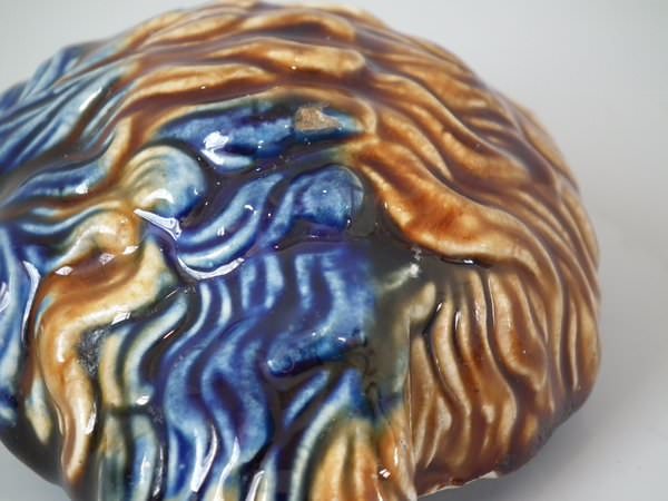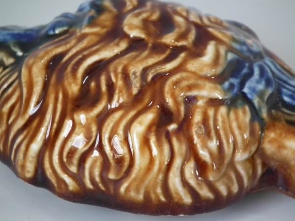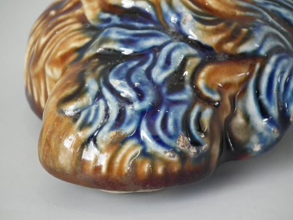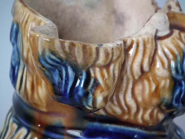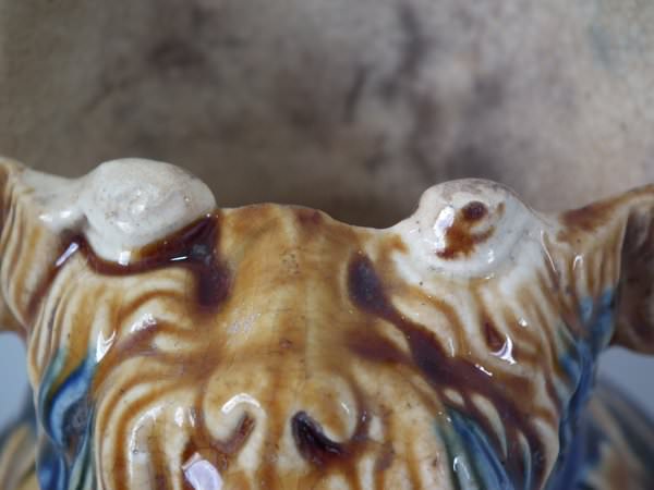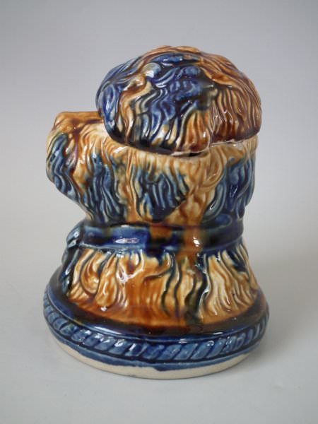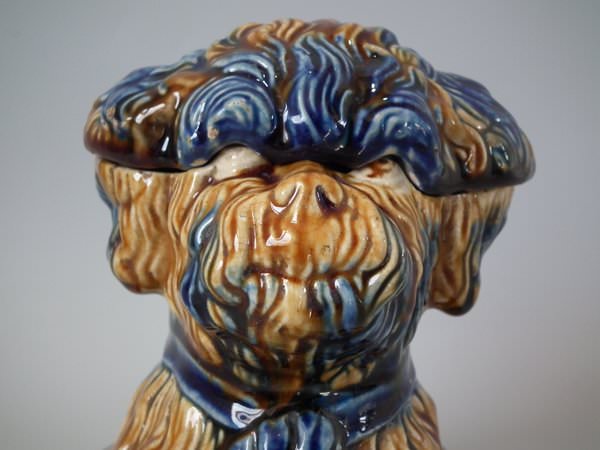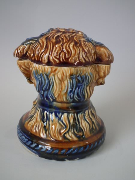 Majolica tobacco jar and cover which features a terrier dog's head.