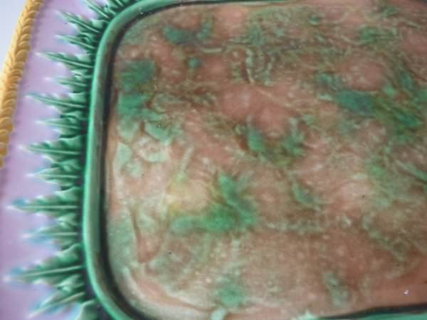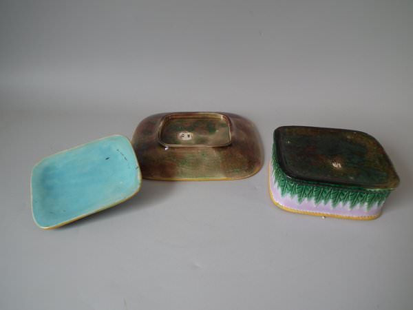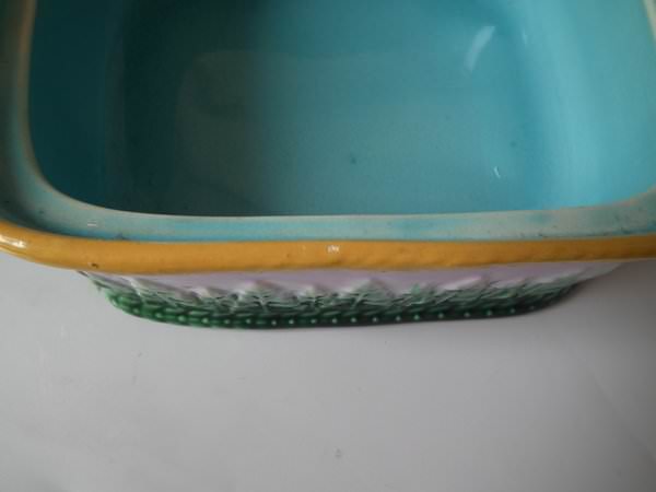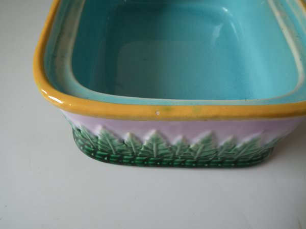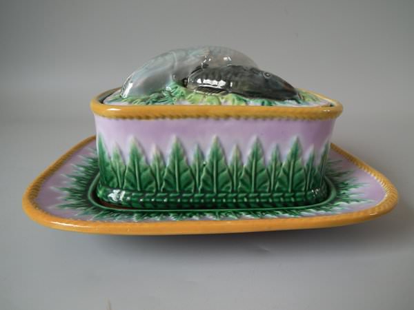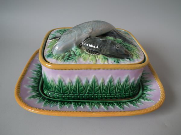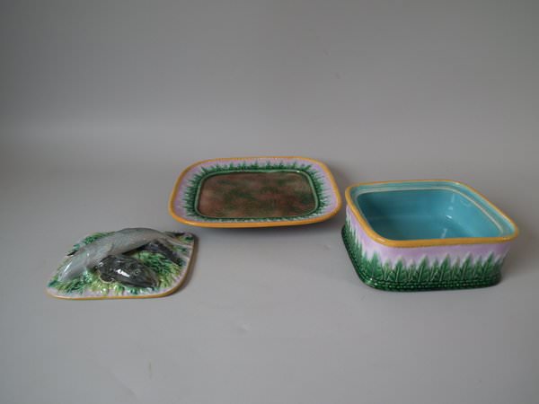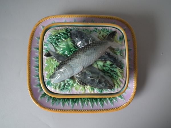 Victorian, circa 1870. 4.3ins high, 8.5ins wide, 7.7ins depth. George Jones Majolica sardine box which features fish and seaweed.