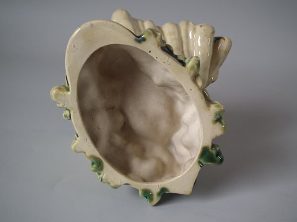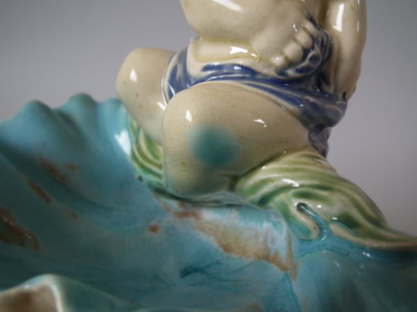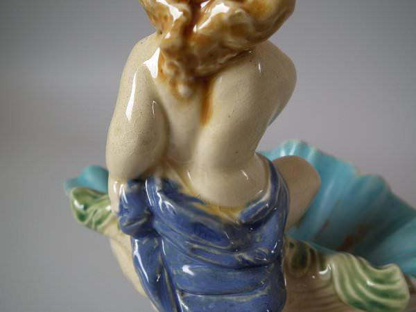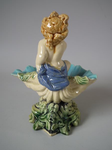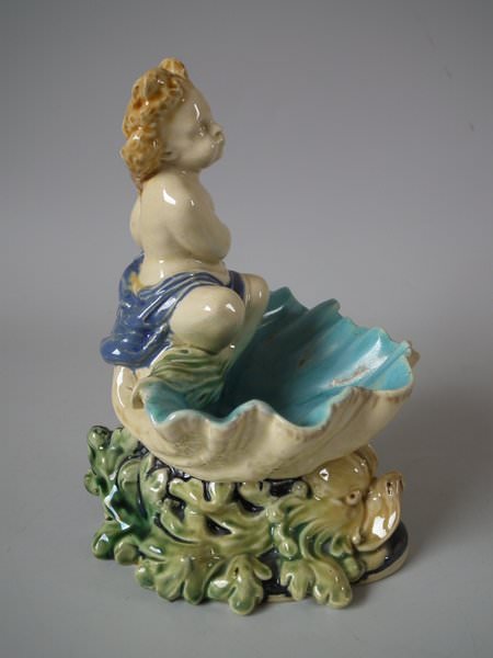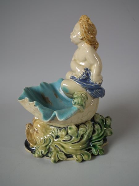 Majolica salt with a mythological theme which features a merman on a clam shell, which sits on a dolphin's back.