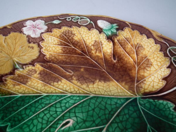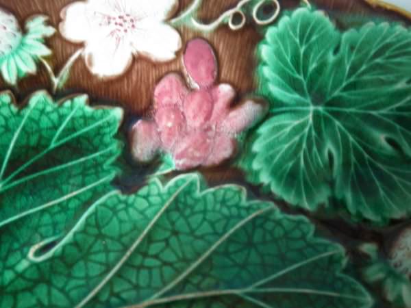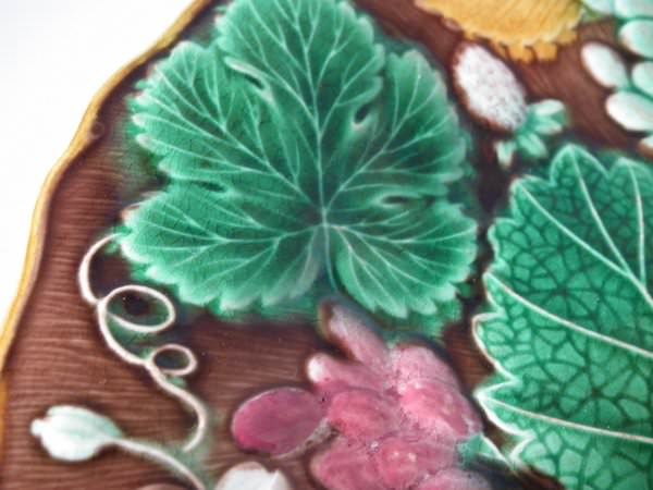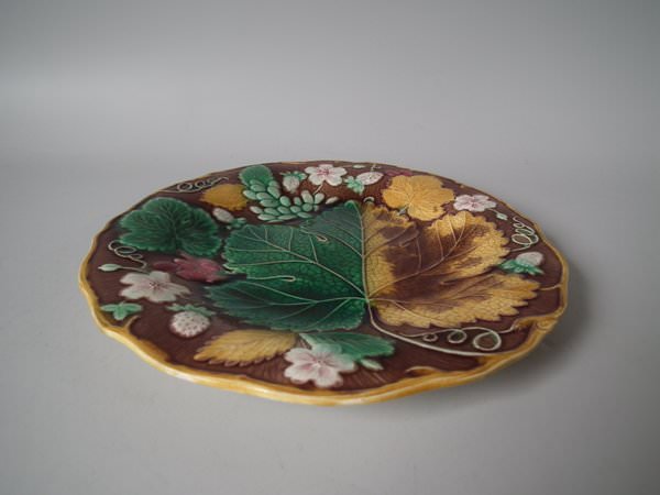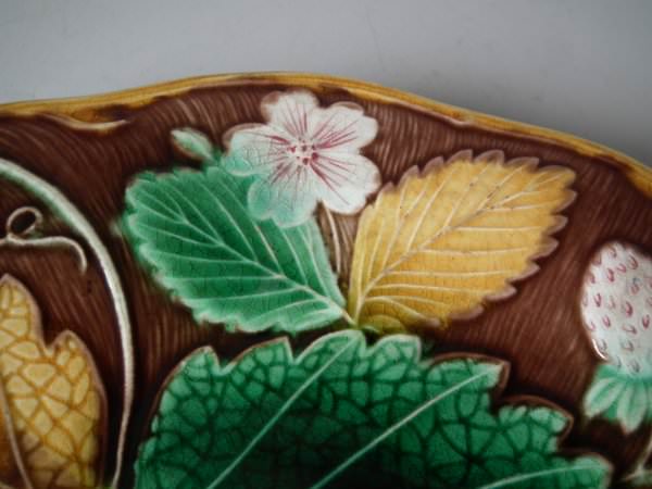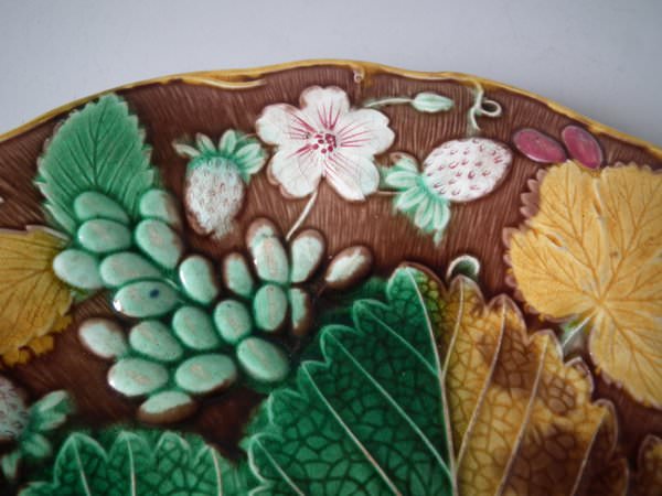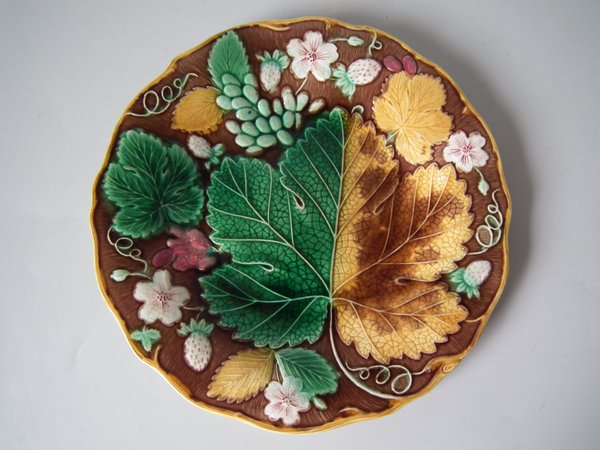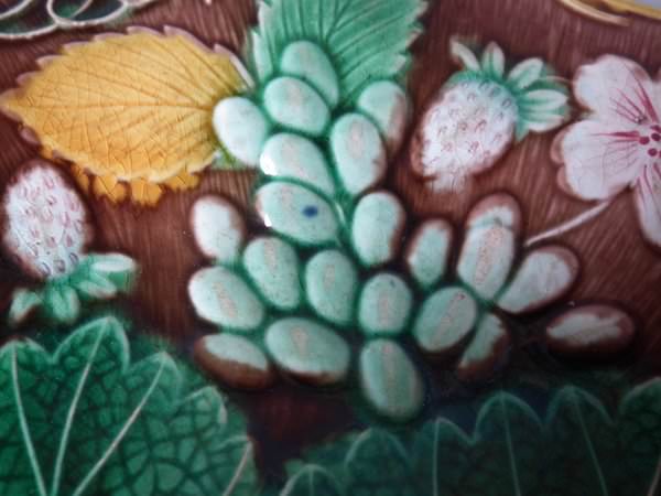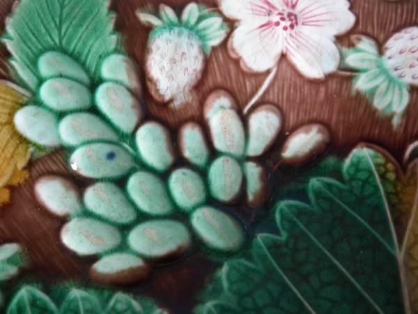 Victorian, circa 1889. 8.7ins high, 8.7ins wide, 0.8ins depth. Wedgwood Majolica plate which features strawberries, leaves, grapes and blossoms. Brown ground version.