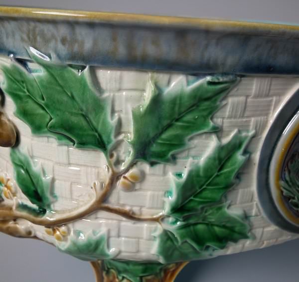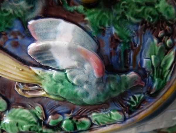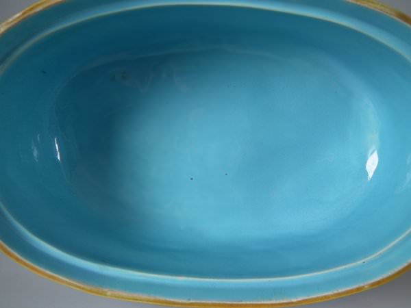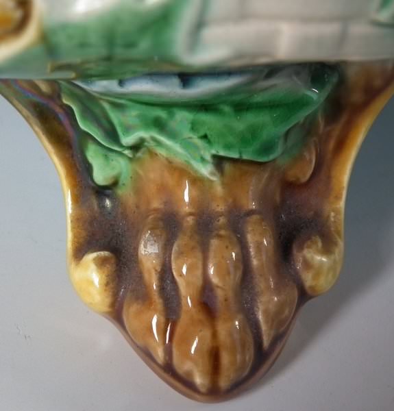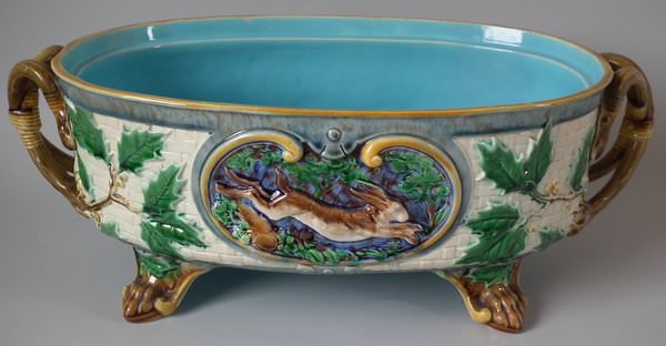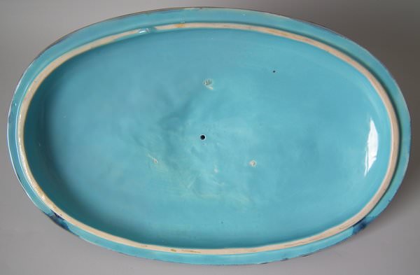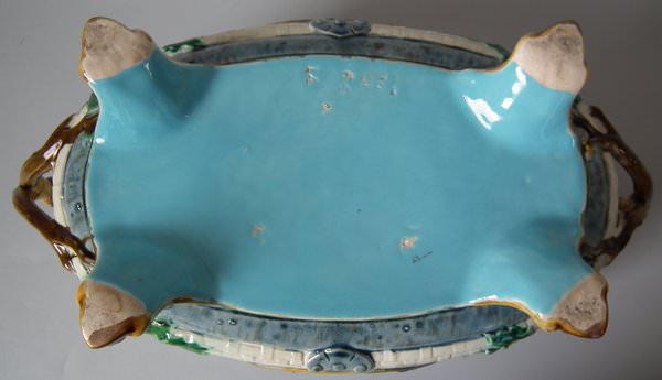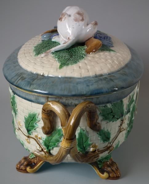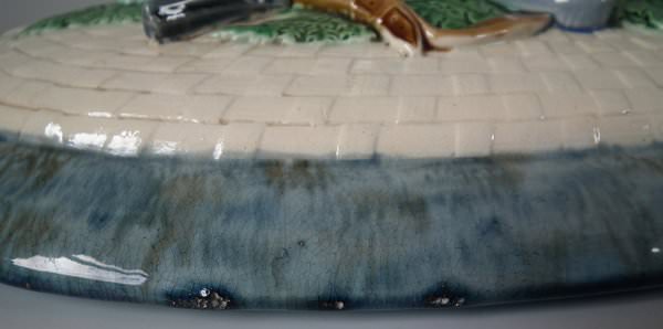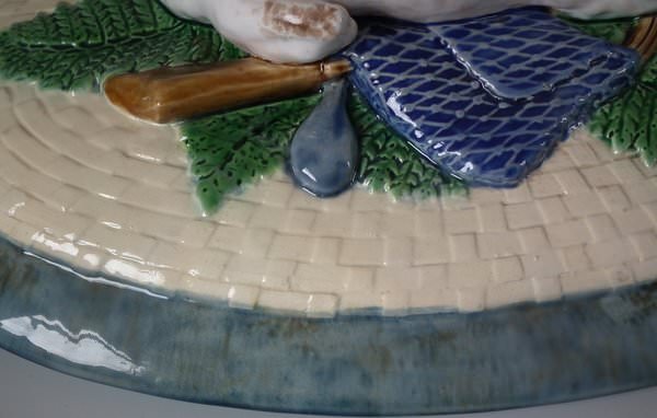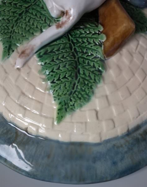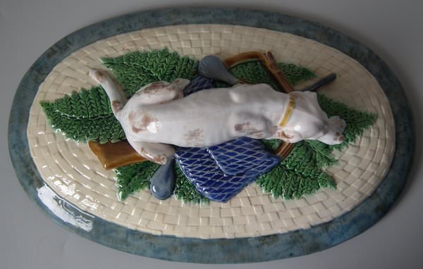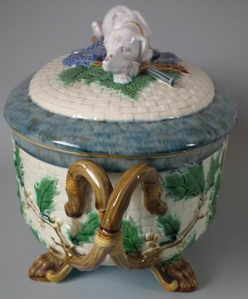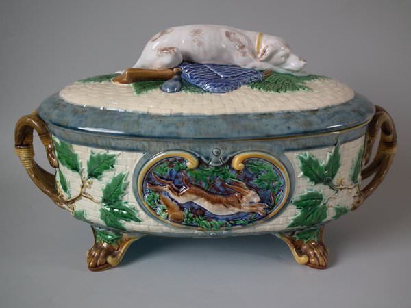 Victorian, circa 1871. 9.6ins high, 16.3ins wide, 8.4ins depth. Minton Majolica game pie dish which features a hunting dog asleep next to a gun, a powder flask and a game bag. Colouration: cream, green, blue, are predominant.