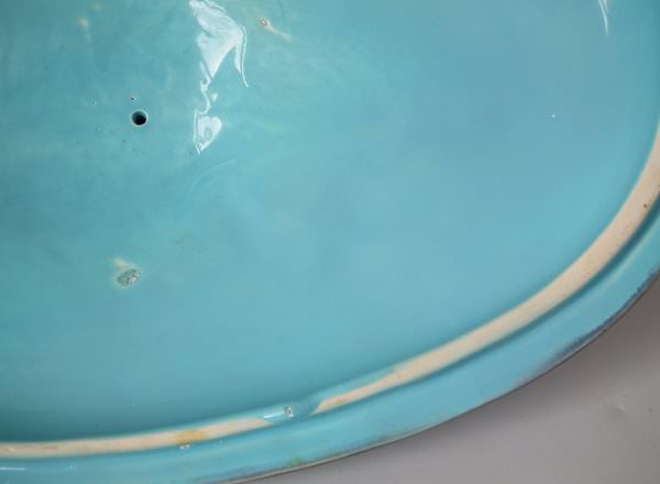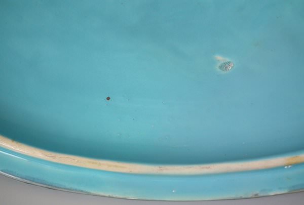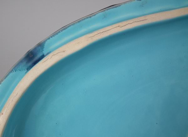 Stabilised and retouched crack running from rim down the side. Another stabilised and retouched crack to the opposite end of the dish.