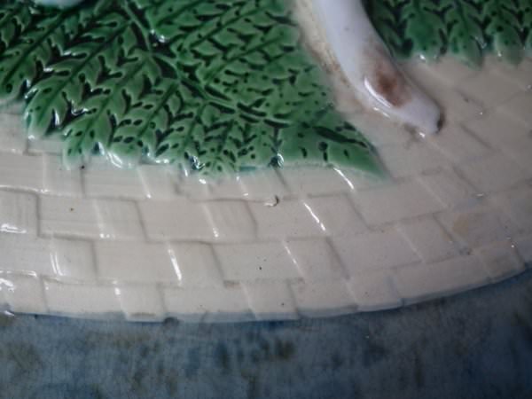 a speck of kiln detritus caught in the glaze to the basketweave ground.