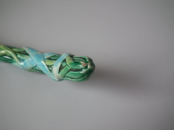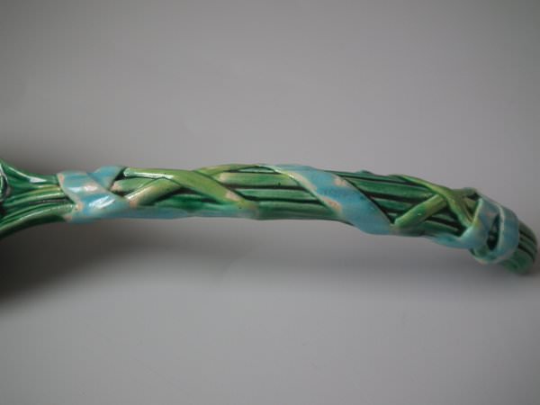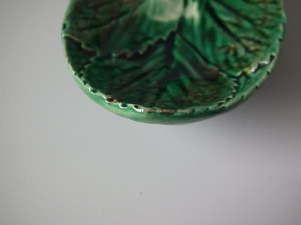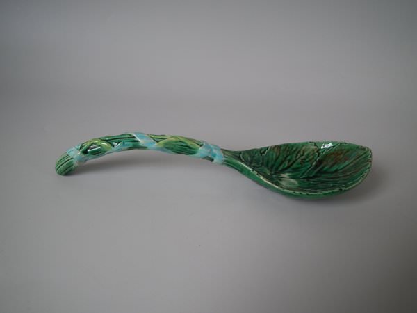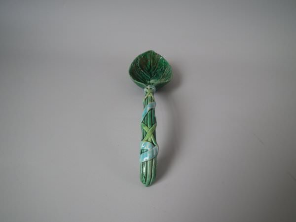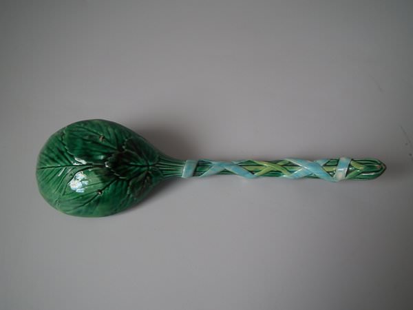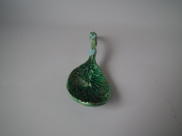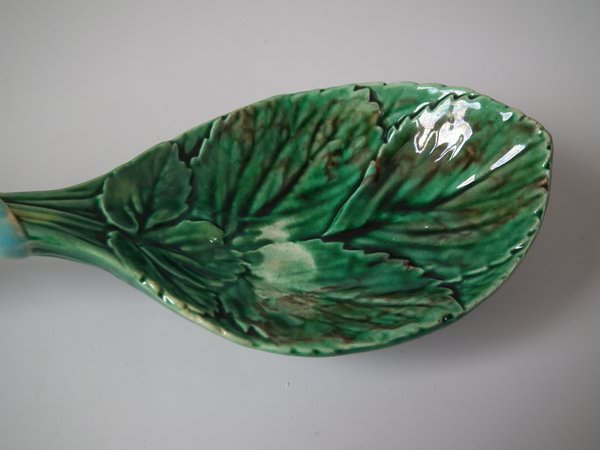 Victorian, circa 1870. 1.2ins high, 7.5ins wide, 2.2ins depth. George Jones Majolica strawberry serving spoon which features strawberry leaves.