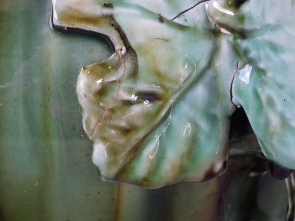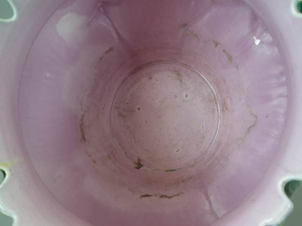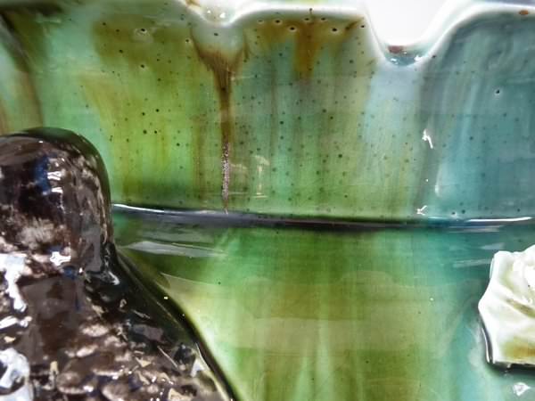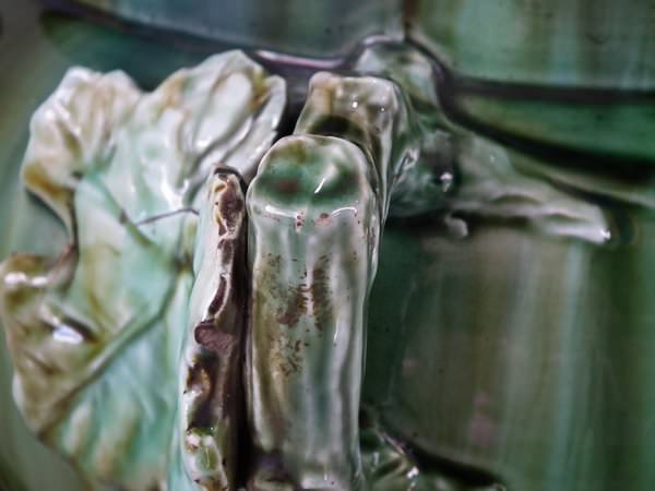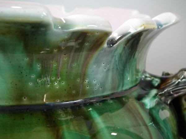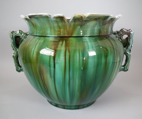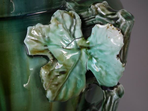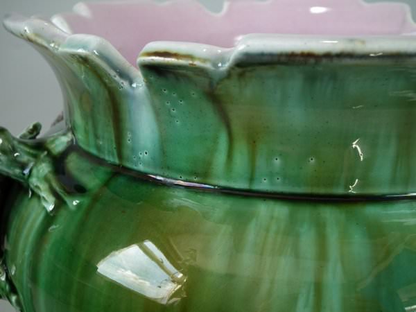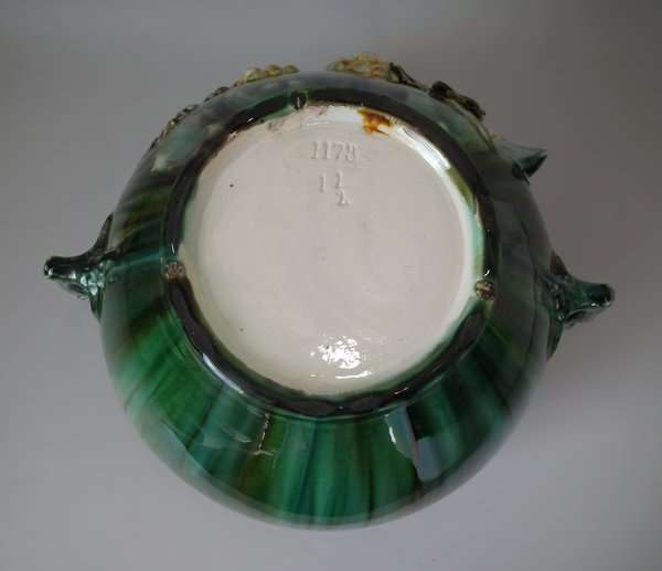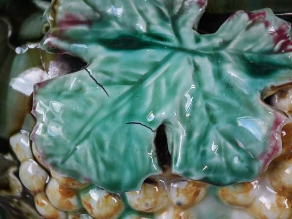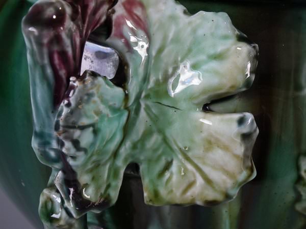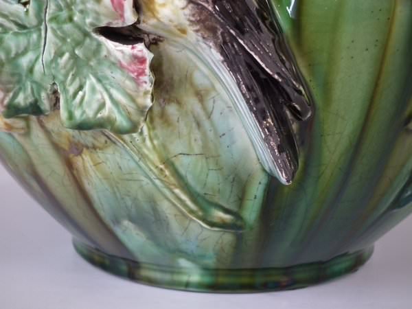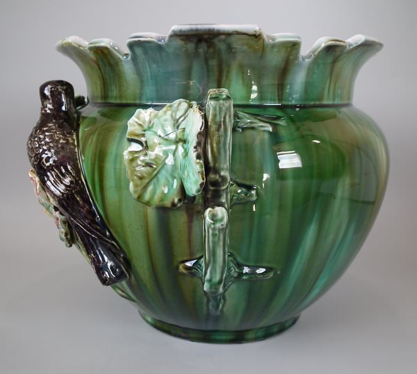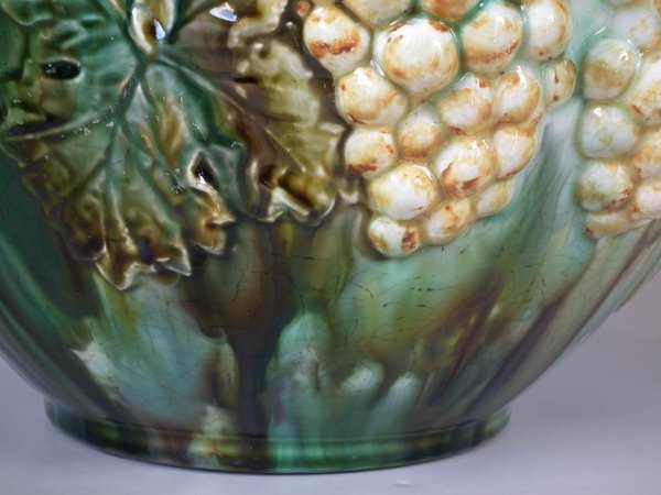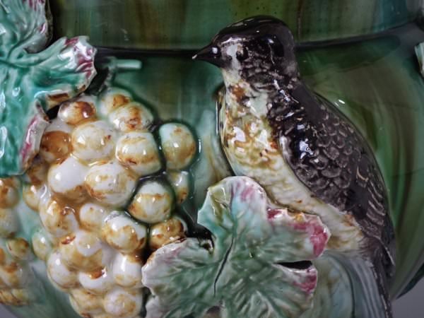 Majolica jardinière which features a bird perched on a grape vine.