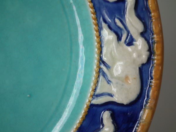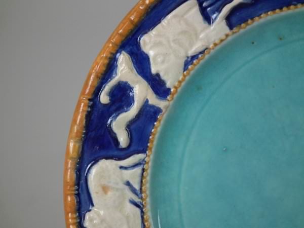 Wedgwood Majolica butter pat which features running animals to the border.