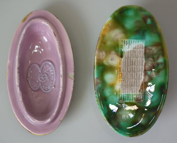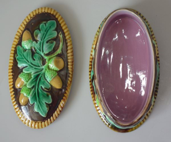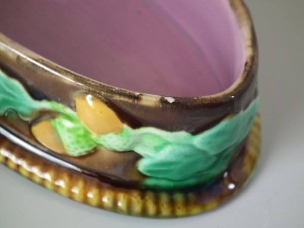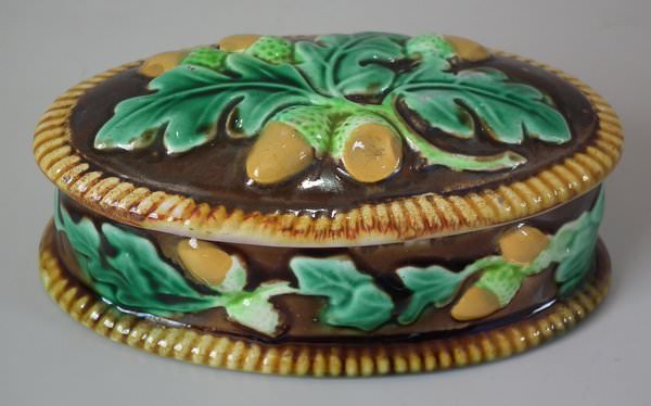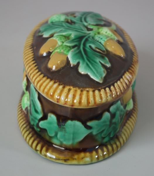 George Jones Majolica match holder which features oak leaves and acorns.