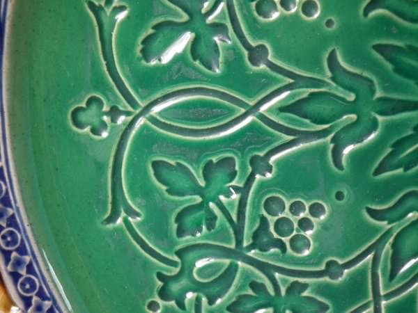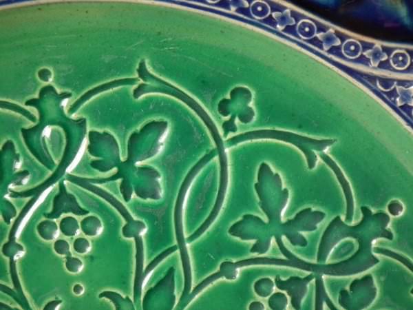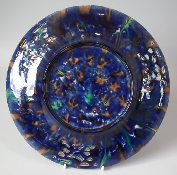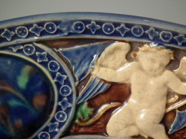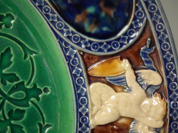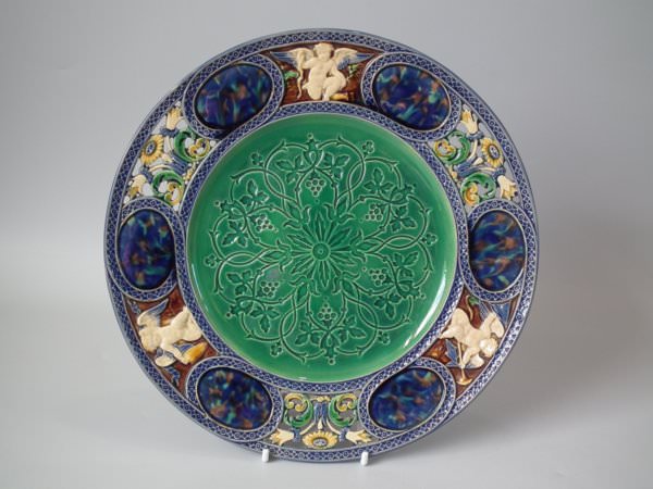 Minton Majolica plate which features embossed floral pattern to centre, surrounded by six mottled plaques, cherub scenes and pierced sections to rim.