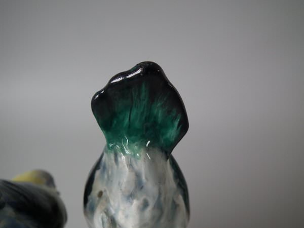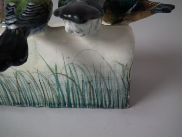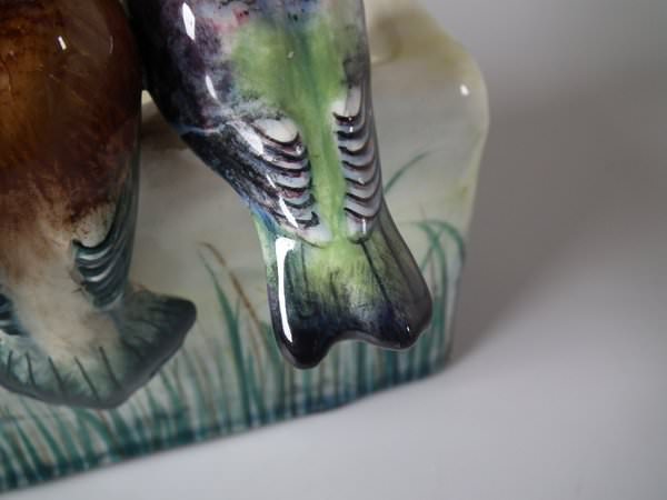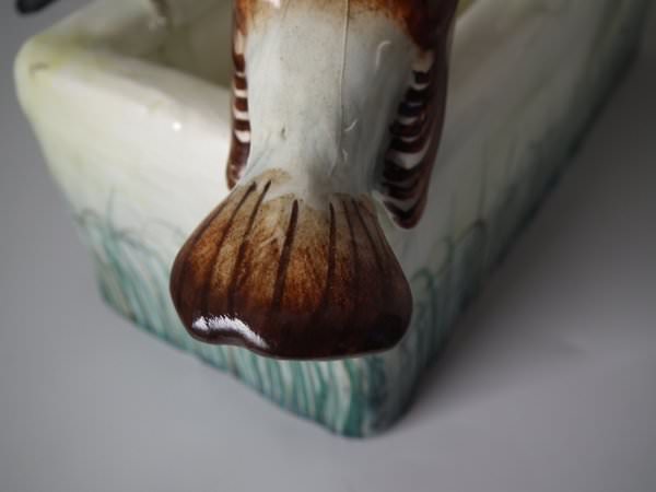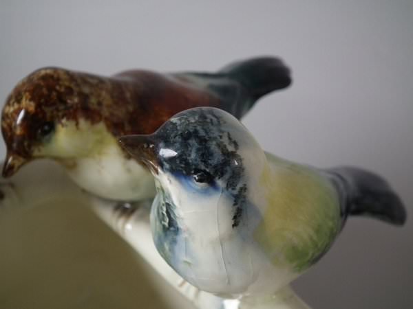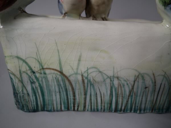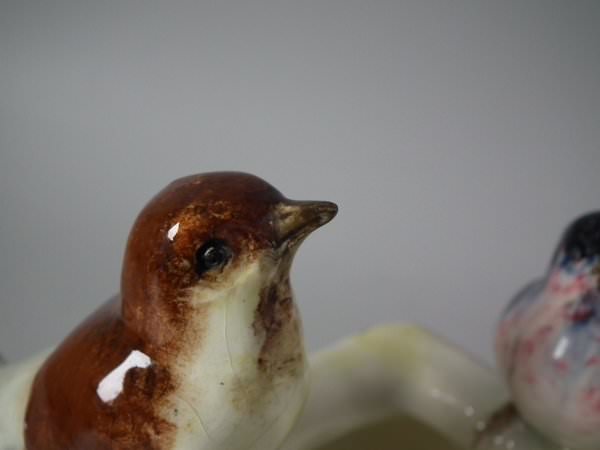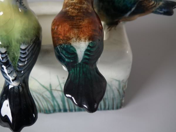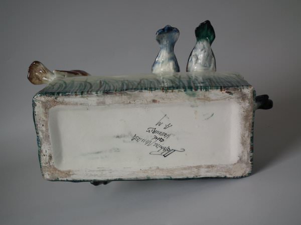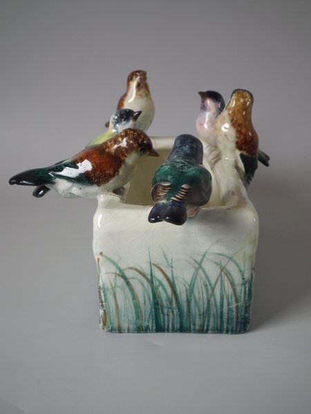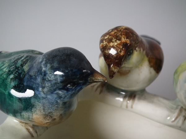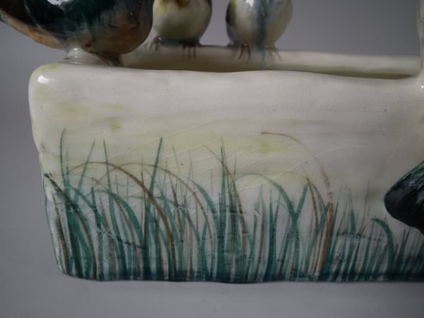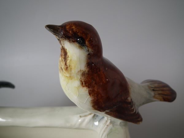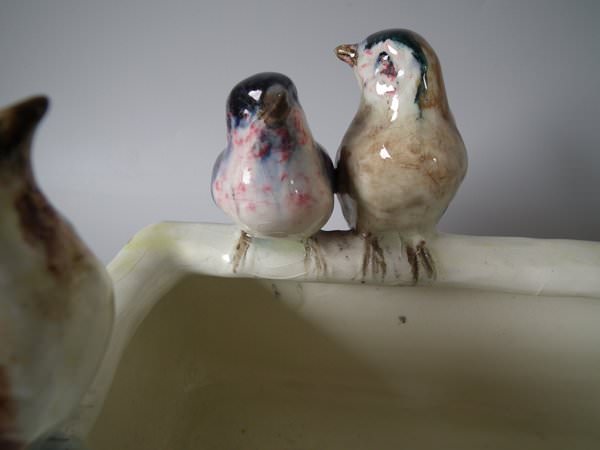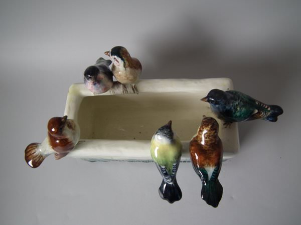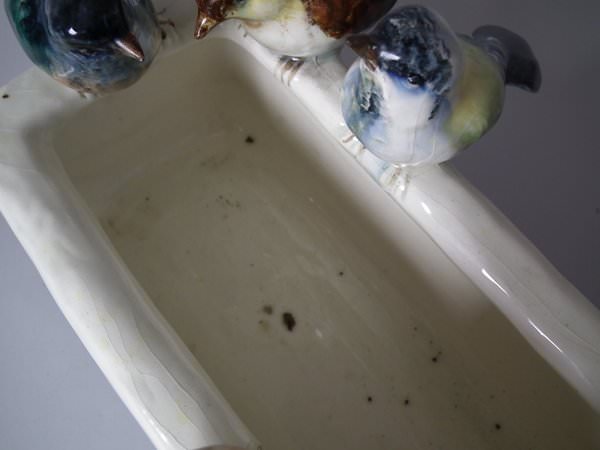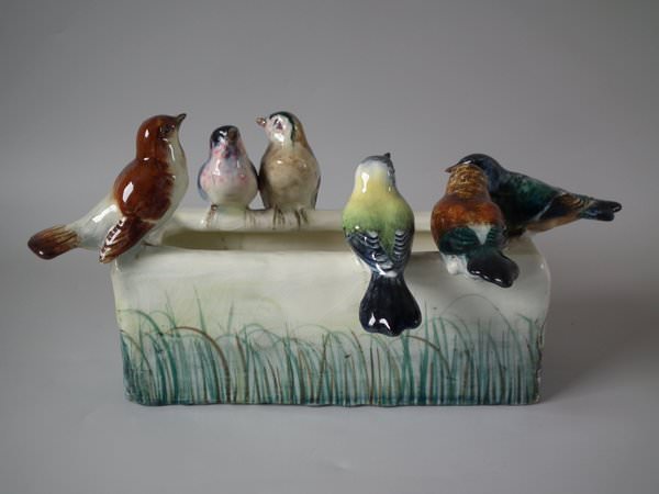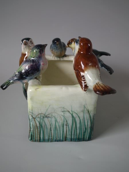 Victorian, circa 1900. 6.7ins high, 8.3ins wide, 13ins depth. Delphin Massier Majolica planter which features six birds (tits) perched on a bird bath.