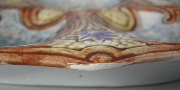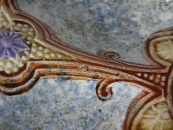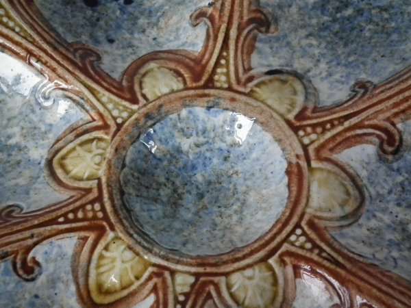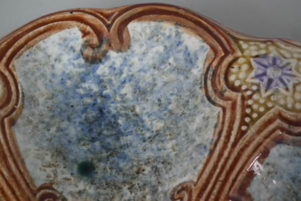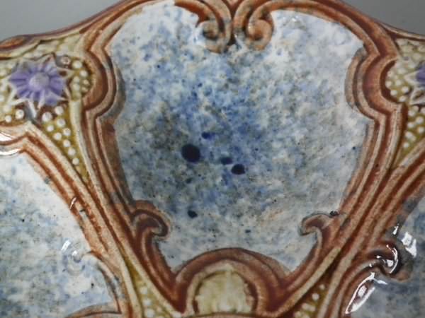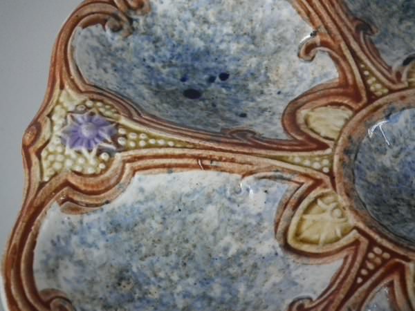 Victorian, circa 1890. 9.6ins high, 9.6ins wide, 1.1ins depth. Majolica oyster plate which features six oyster wells surrounding a circular central well. Colouration: blue, brown, ochre, are predominant.