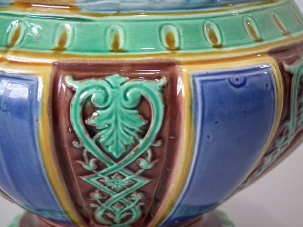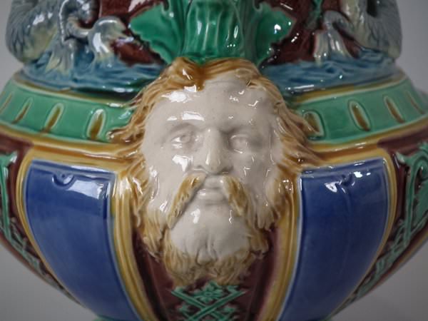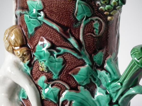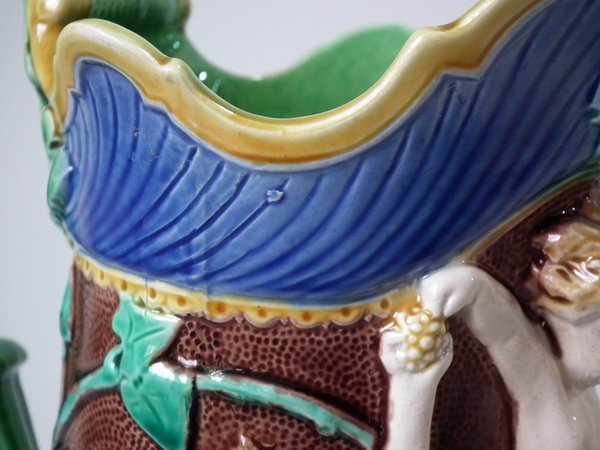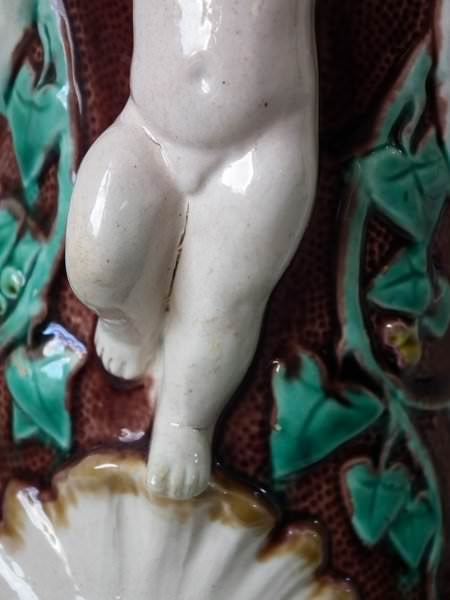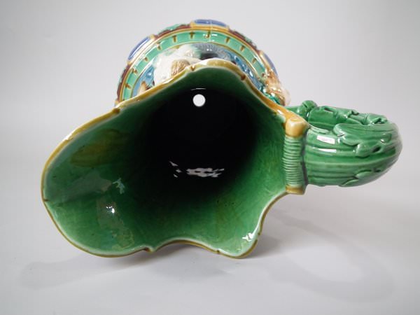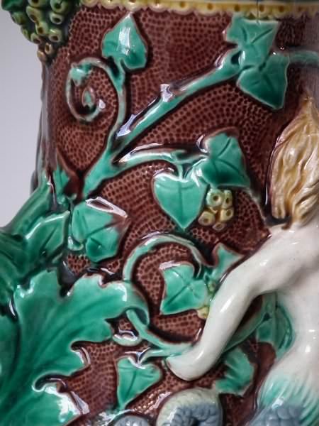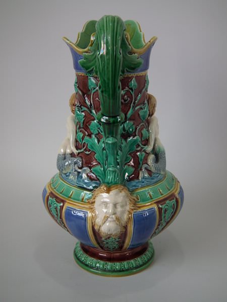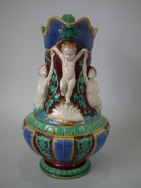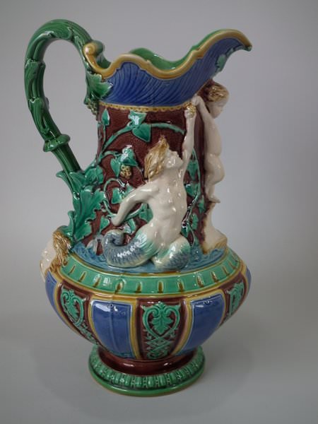 Minton Majolica jug/pitcher which features a putti being held aloft by a mermaid on one side and a merman on the other.