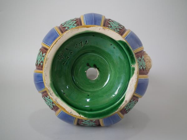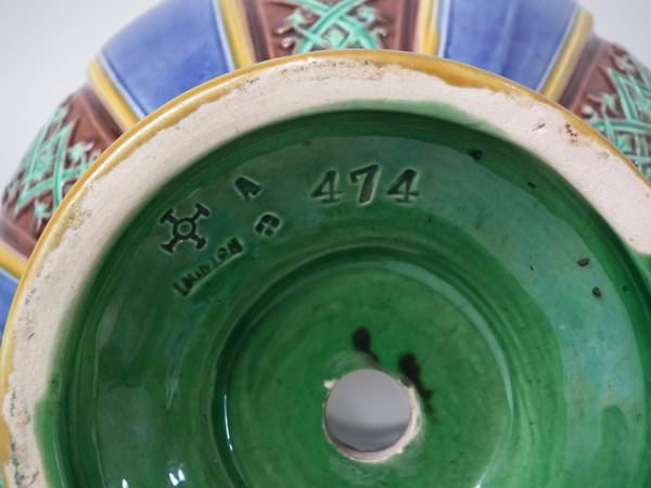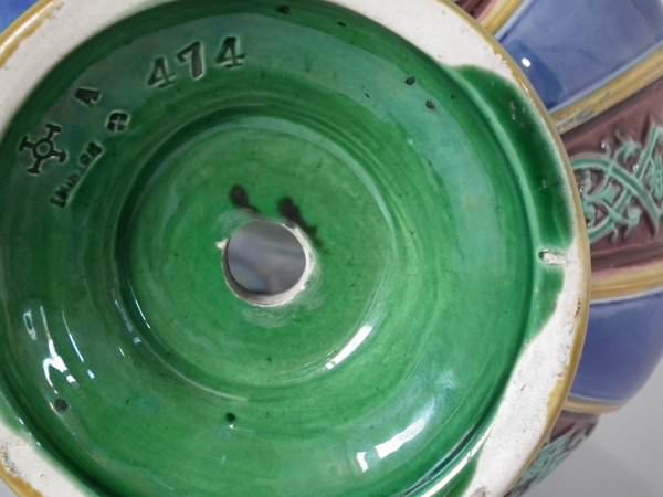 The piece bears maker's marks for the Minton pottery. Bears a pattern number, '474'. Marks include a factory specific date cipher for the year 1873.