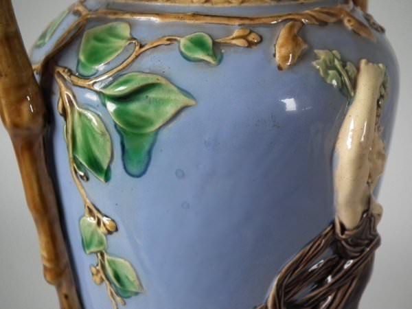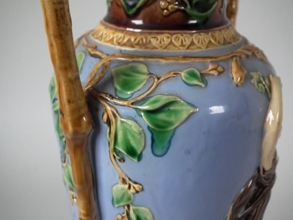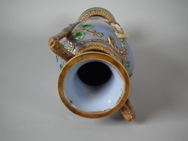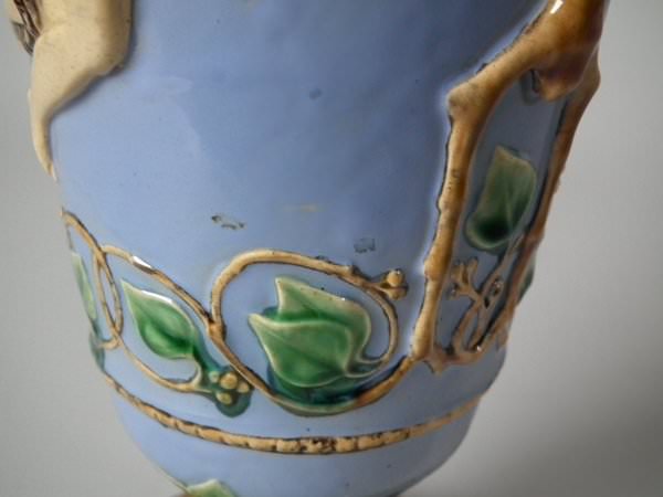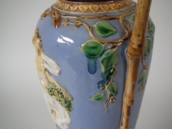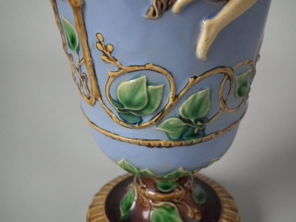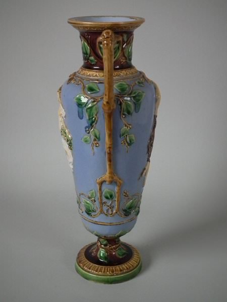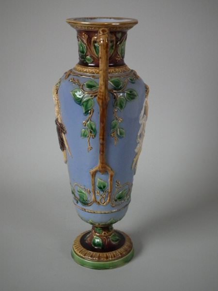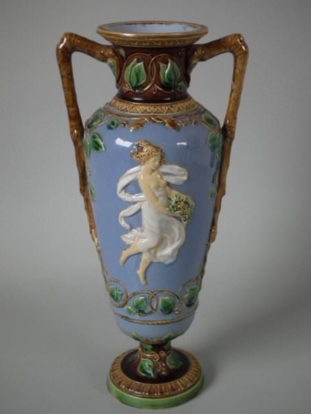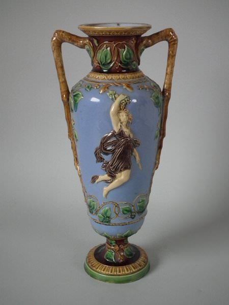 Victorian, circa 1870. 12ins high, 5.5ins wide, 4.3ins depth. Minton Majolica vase which features two maidens, one holding fruit and flowers, the other holding grapes.