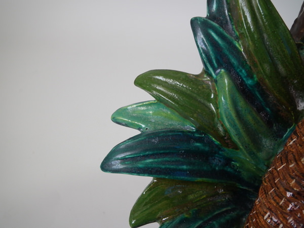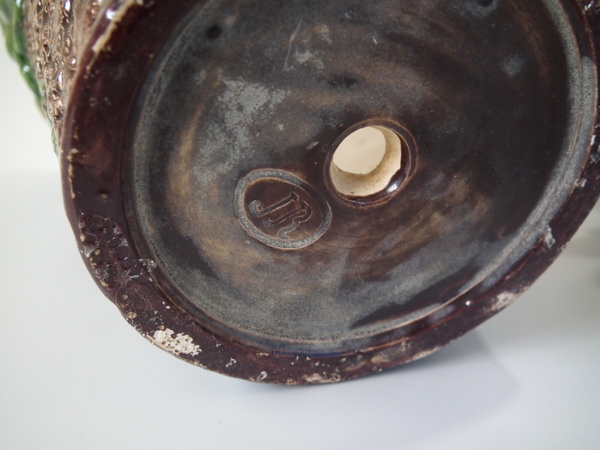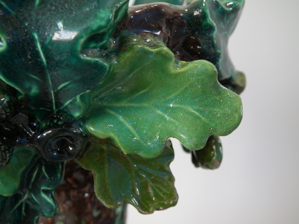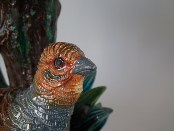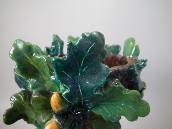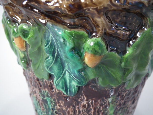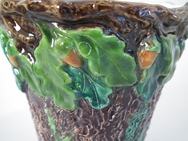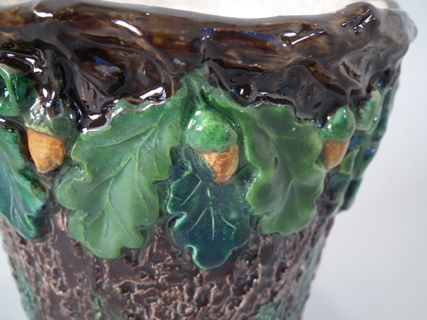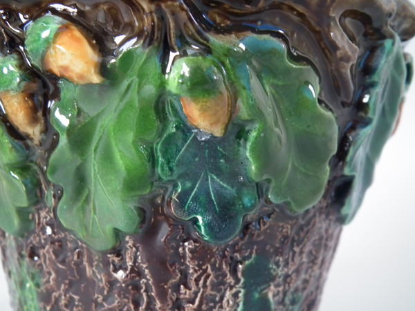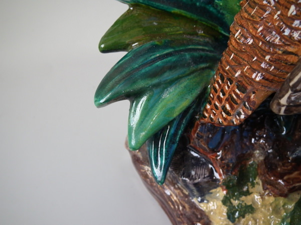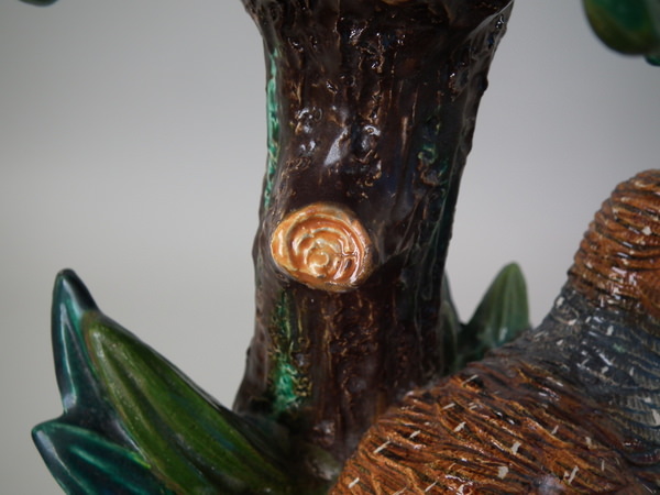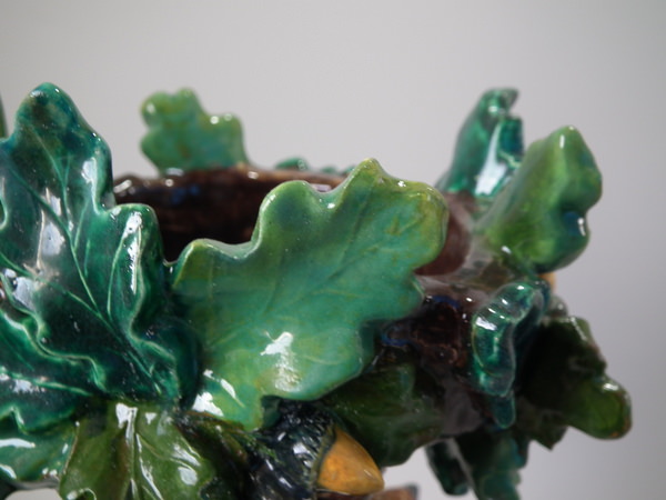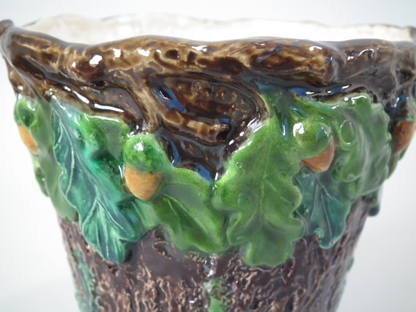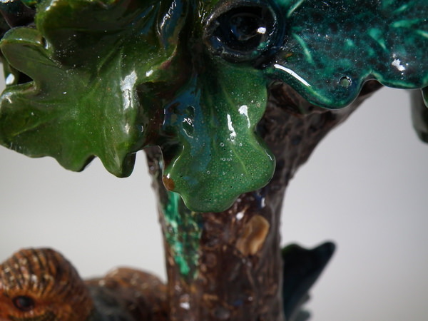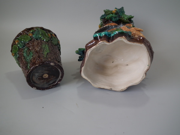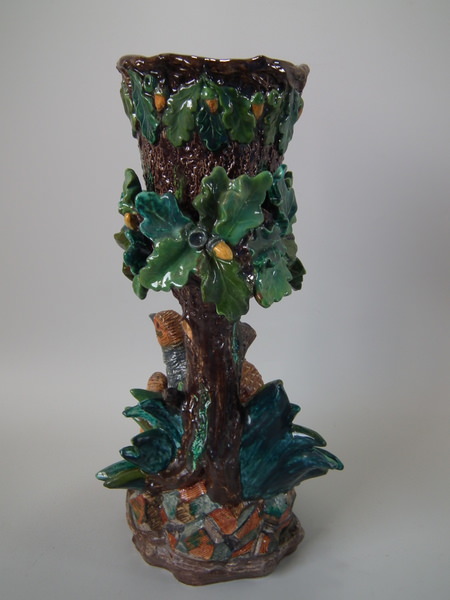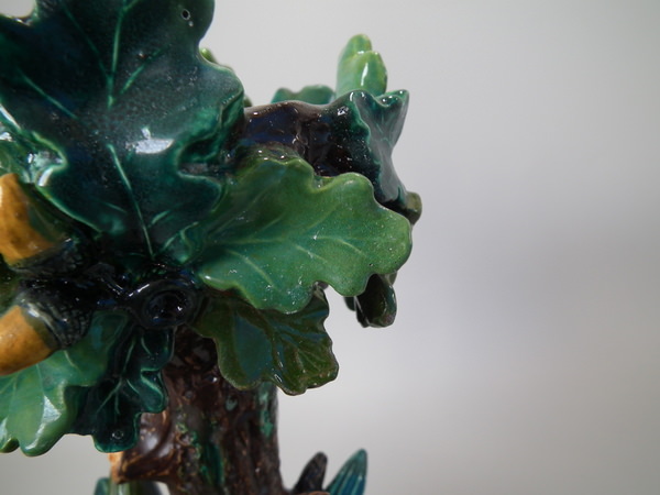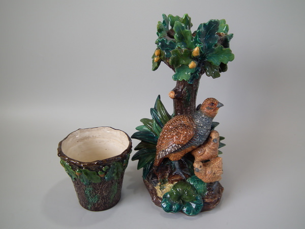 Victorian, circa 1880. 15.4ins high, 7.9ins wide, 5.9ins depth. Lonitz Majolica cache pot and stand which features a partridge and two chicks in front of an oak tree.