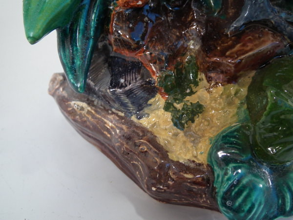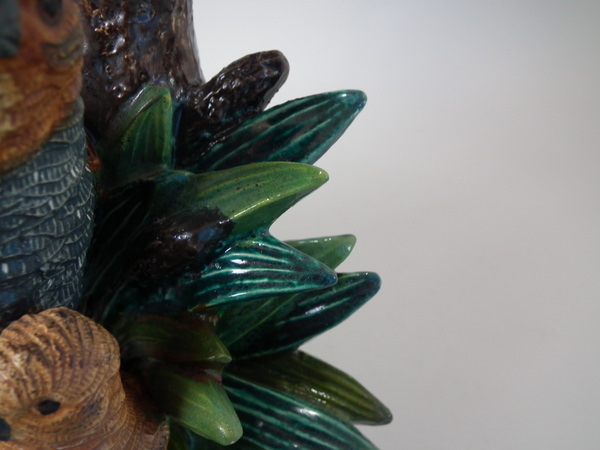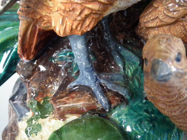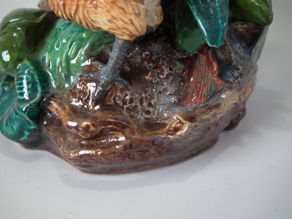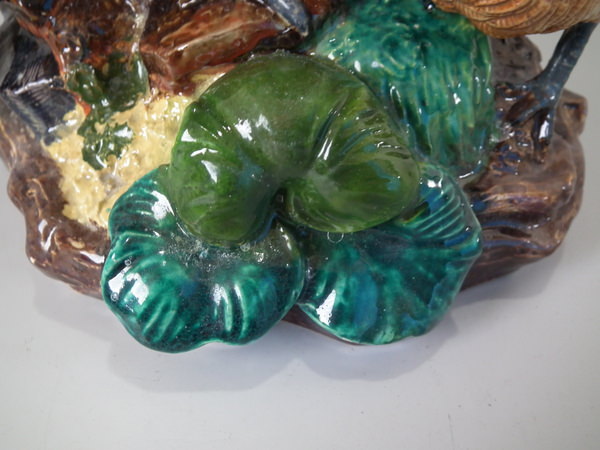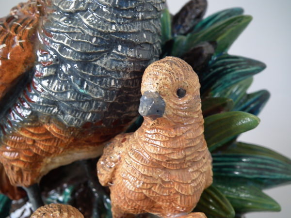 Hugo Lonitz Majolica partridge & chicks stand with pot