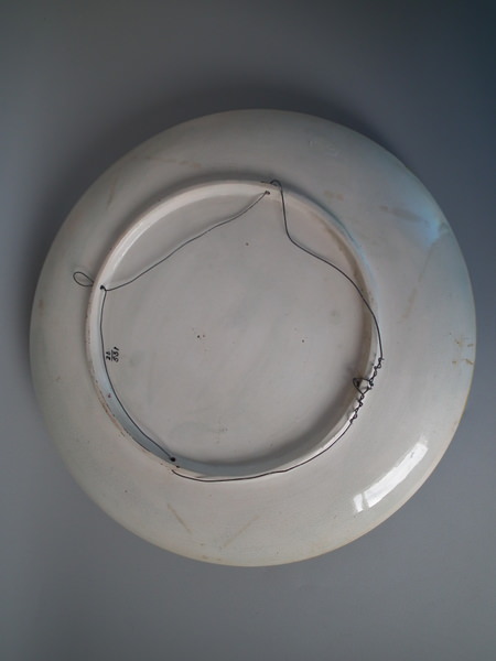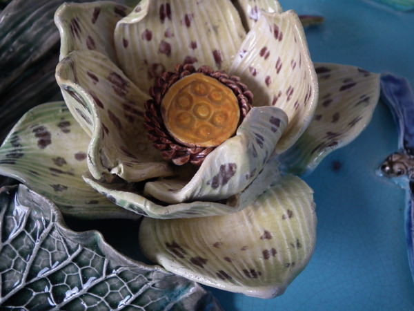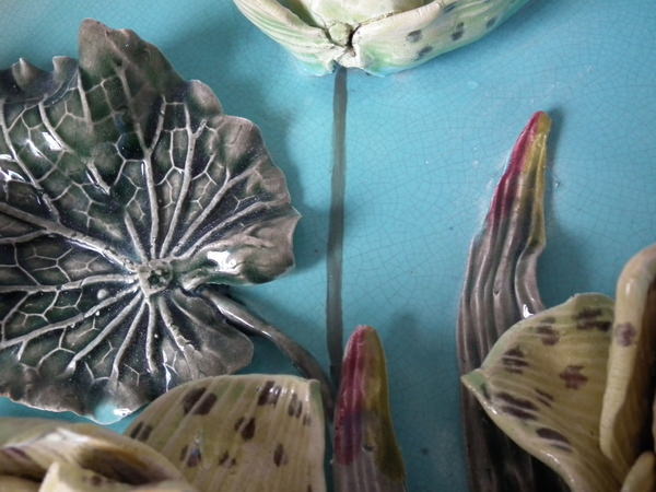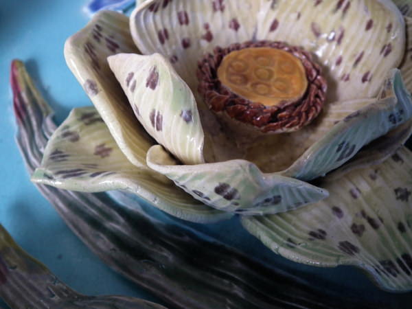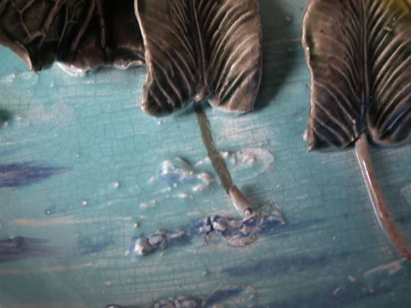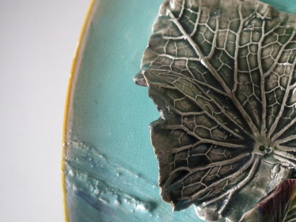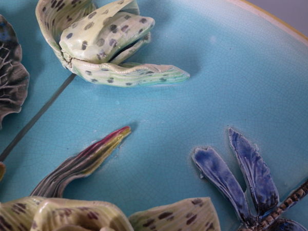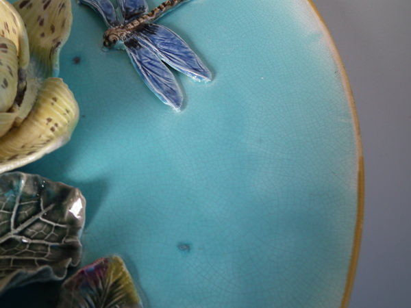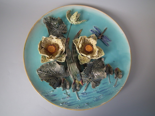 Victorian, circa 1880. 15.7ins high, 15.7ins wide, 3.5ins depth. Fielding Majolica wall charger which features separately molded flowers and a dragon fly in deep relief.