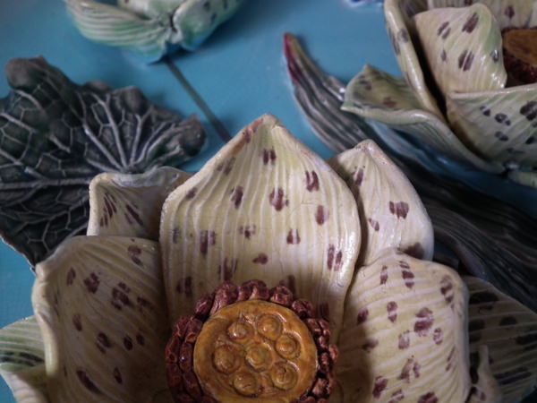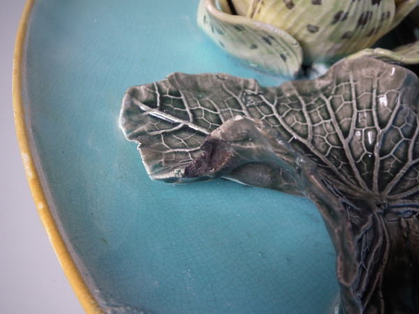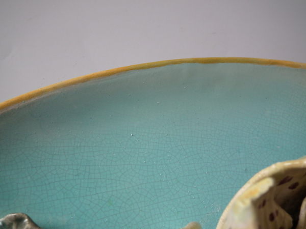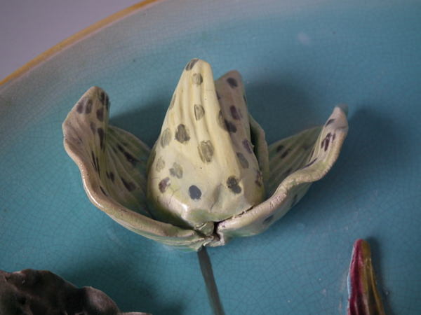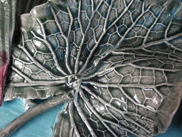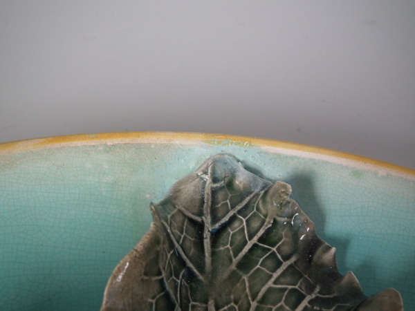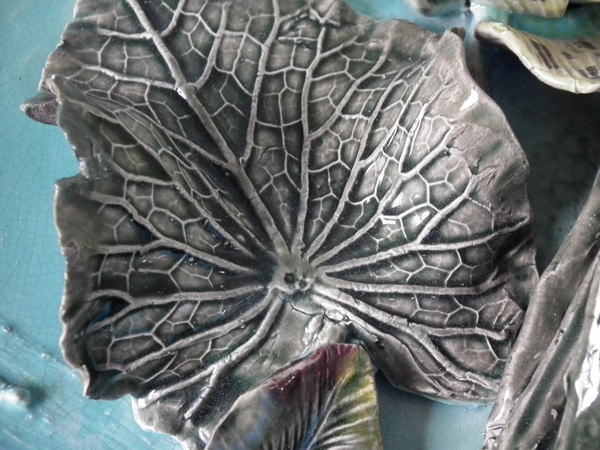 KILN EFFECTS: a few specks of kiln detritus caught in the glaze to the leaves;