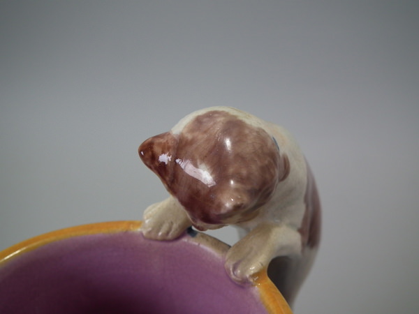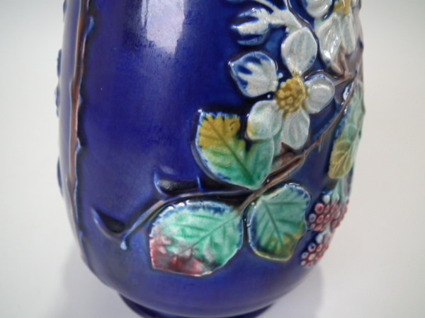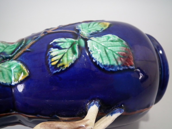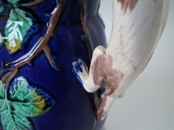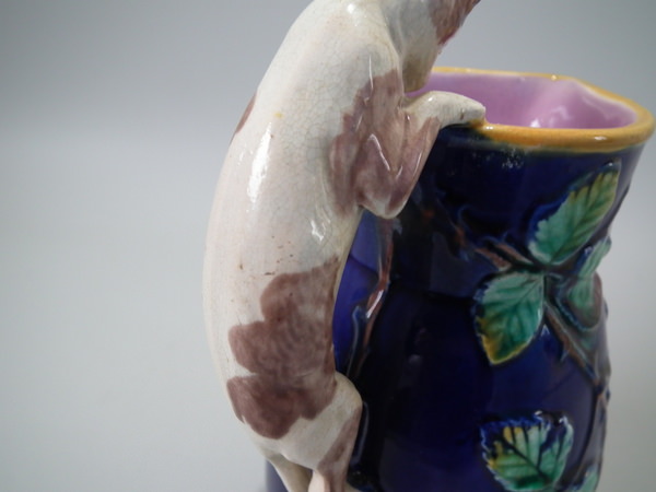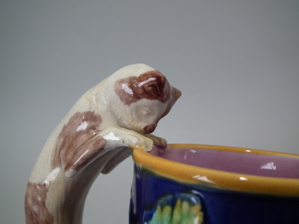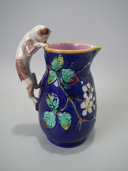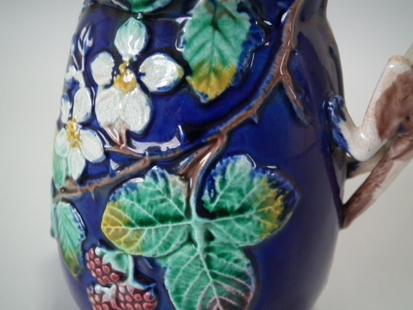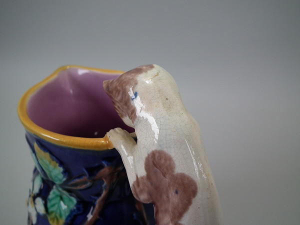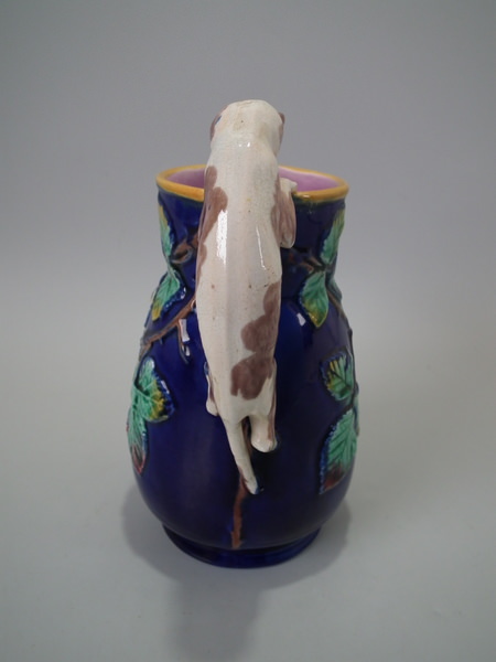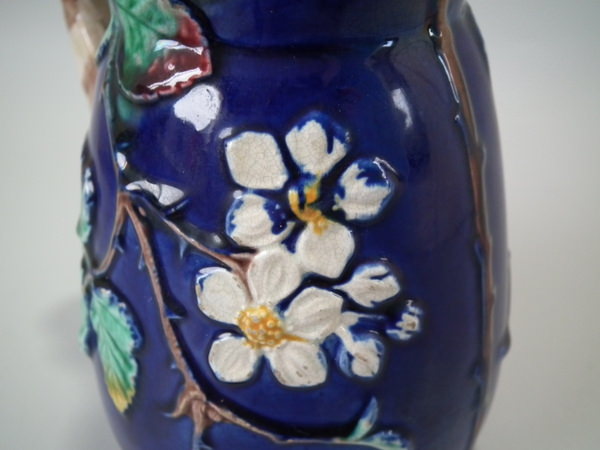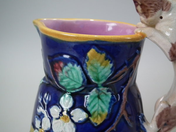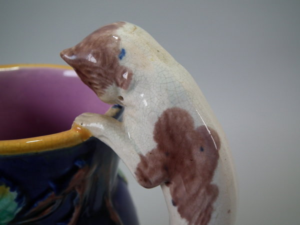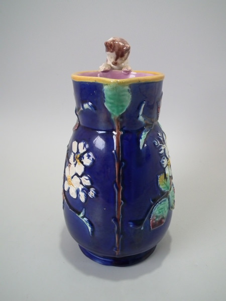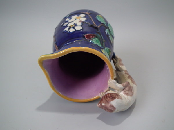 Victorian, circa 1870. 7.7ins high, 4.7ins wide, 3.2ins depth. Majolica jug/pitcher which features blossom and berries and a cat forming the handle.