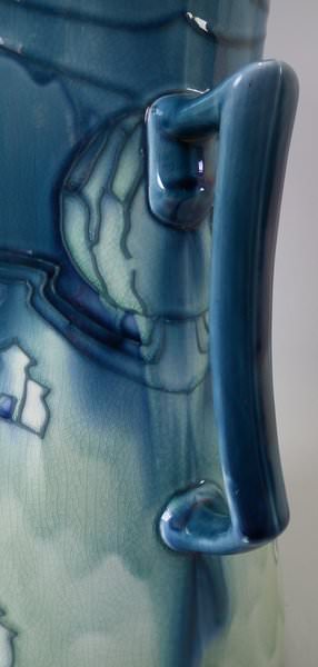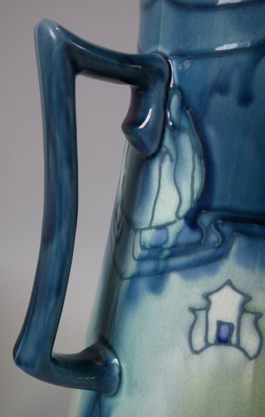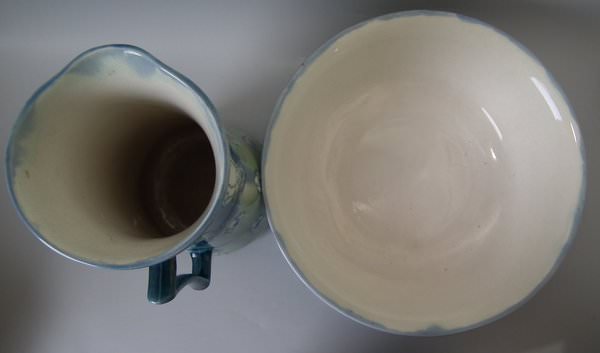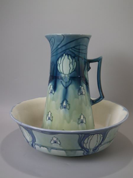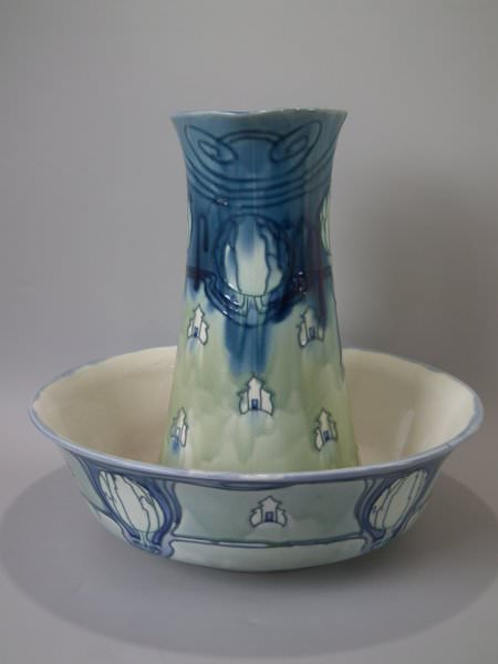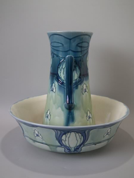 Circa 1910. Jug 14.5ins high, Bowl 16.5ins diameter. Minton Secessionist No.7 jug and wash bowl. Decorated in shades of blue with grey tube lined art nouveau motifs. Cream interior to both.