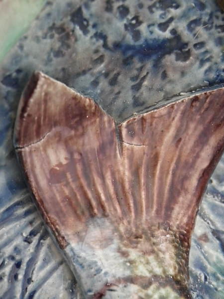 KILN EFFECTS: a few tiny shrinkage cracks to fish's tail fin, lizard's legs and a couple of the leaves.
