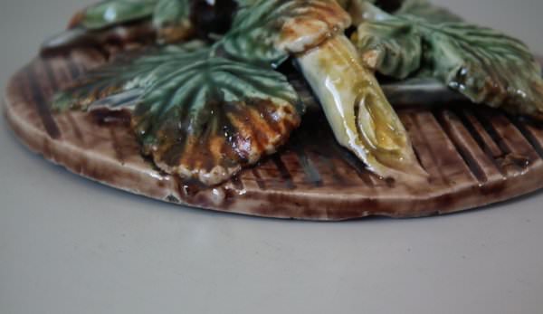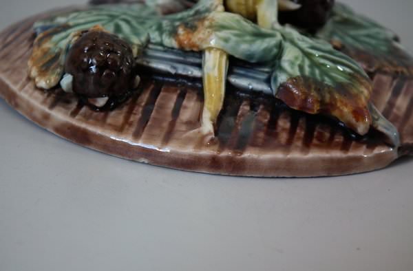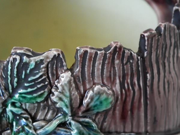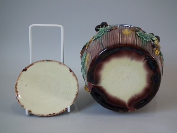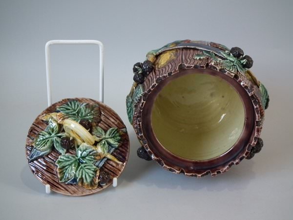 Thomas Sergent Majolica tobacco jar and cover which features a barrel with blackberry fruit and leaves around the sides.