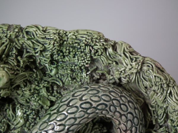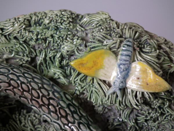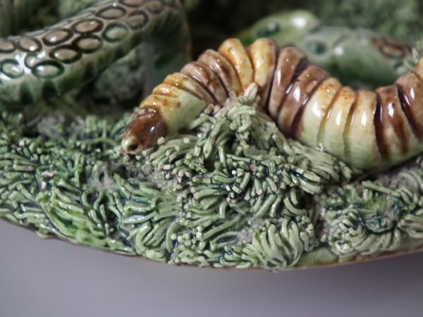 Cunha Portuguese Palissy Majolica wall plate which features a lizard attacking a snake, moths and a grub.