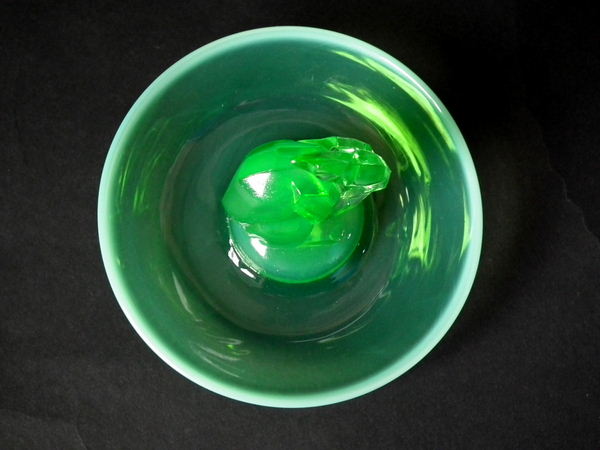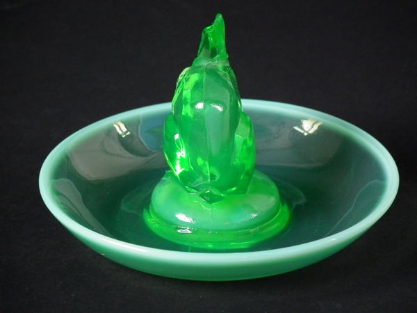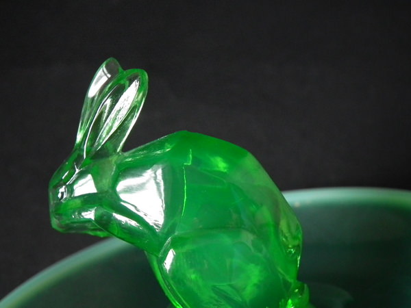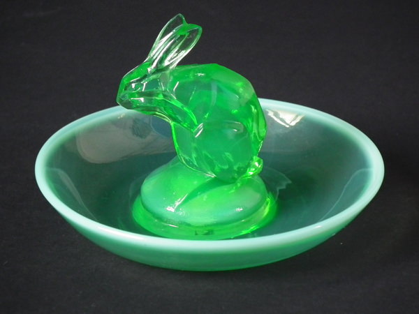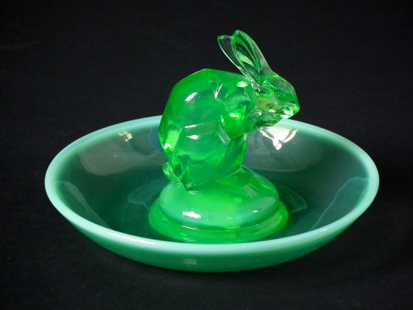 René Lalique Green opalescent Glass 'Lapin ( Rabbit)' Cendrier ashtray. Engraved makers mark, 'R Lalique France No 285'. Book reference: Marcilhac 285.