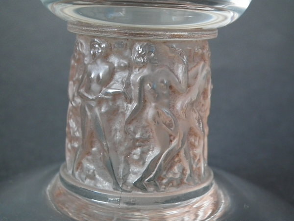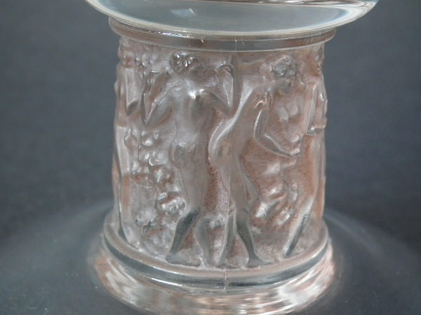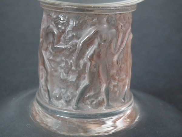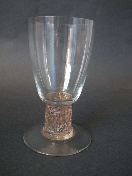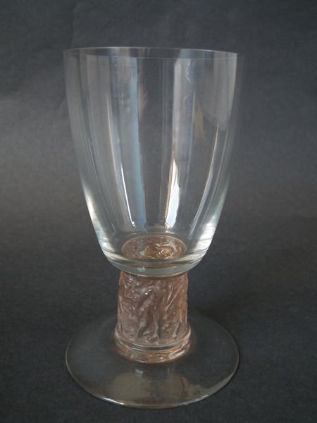 Introduced in 1912. Height: 14.7cm (5.79ins). Width: 8.8cm (3.46ins). Depth: 8.8cm (3.46ins).. Rene Lalique Clear glass with sepia stained stem, 'Frise Personnages' drinking glass. Engraved makers mark, 'R. Lalique France No 3750'. Book reference: Marcilhac 3750.