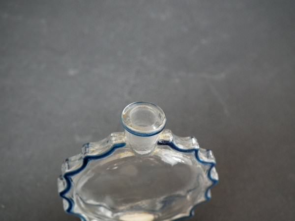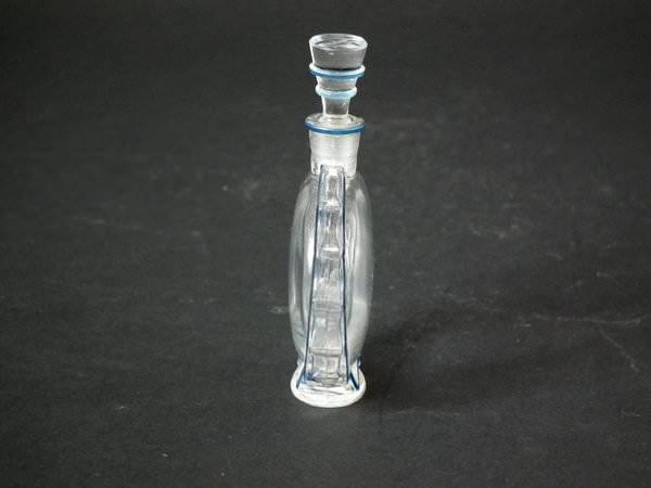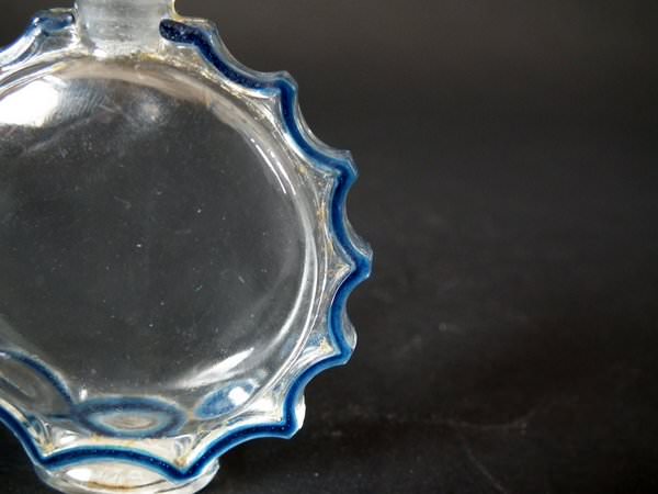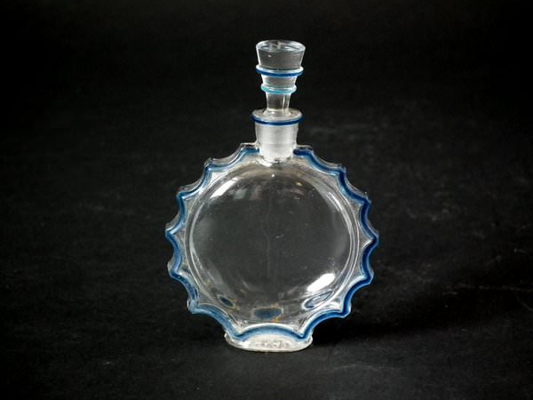 Introduced in 1944. Height: 7.5cm (2.95ins). Width: 5cm (1.97ins). Depth: 1.5cm (0.59ins).. Rene Lalique Clear with blue staining Glass 'Worth - Requete' Flacon (Perfume bottle).