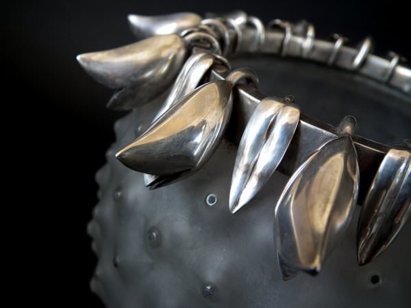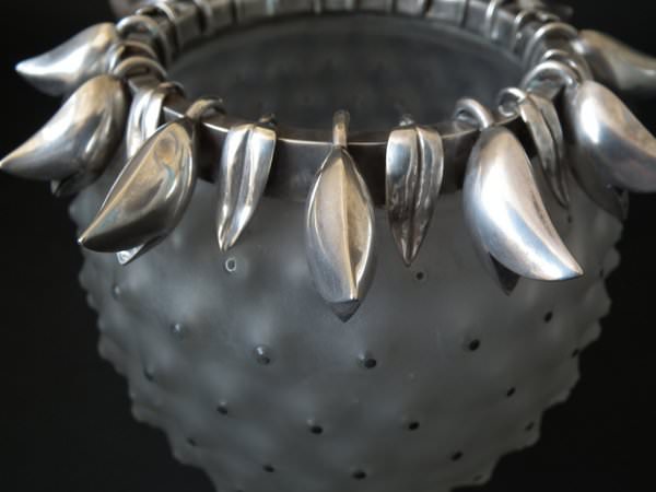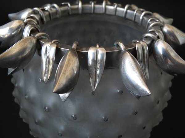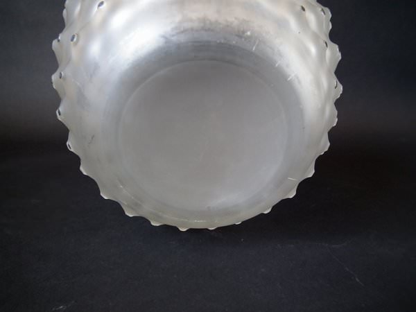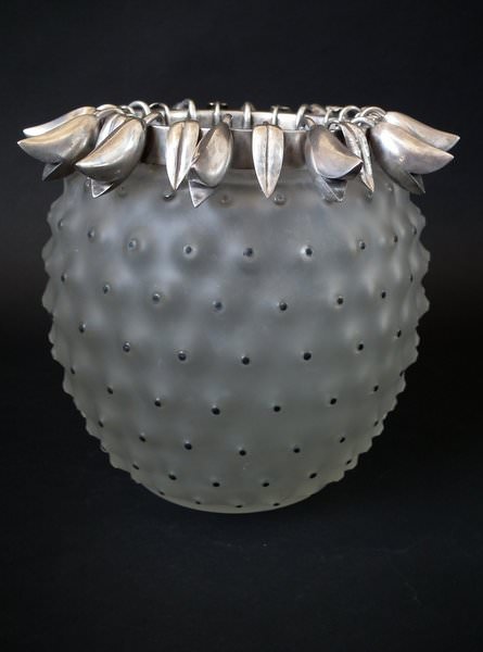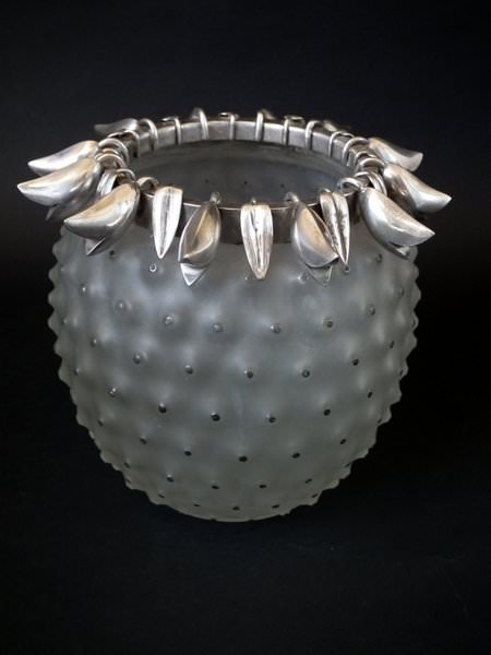 Introduced in 1933. Height: 14.5cm (5.71ins). Width: 16.5cm (6.5ins). Depth: 16.5cm (6.5ins).. Rene Lalique Clear and frosted glass with black enamelling 'Cactus' Vase. Silver rim.