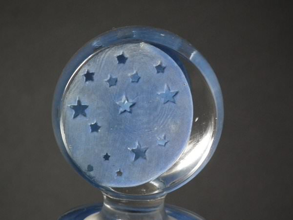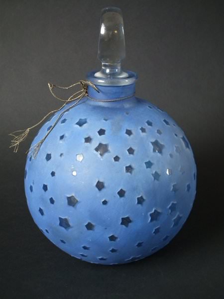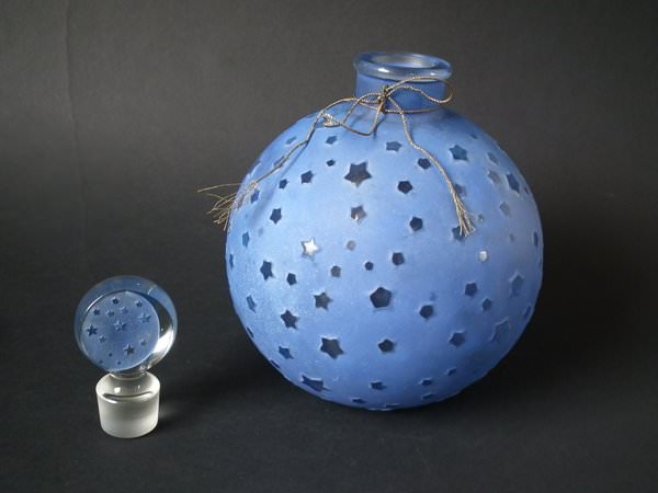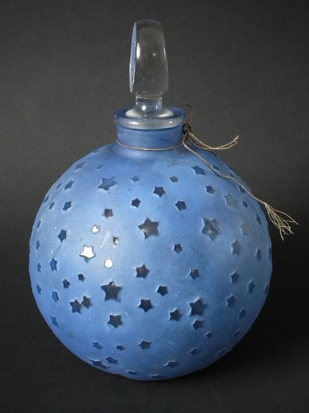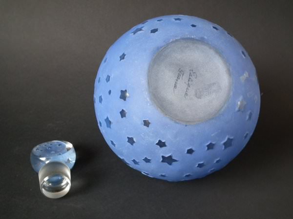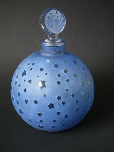Introduced in 1924. Height: 25cm (9.84ins). Width: 17cm (6.69ins). Depth: 17cm (6.69ins).. Renè Lalique Clear with blue staining Glass, 'Dans La Nuit' Perfume bottle.
