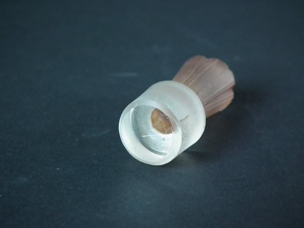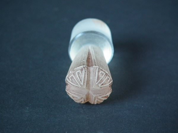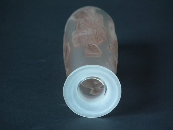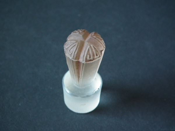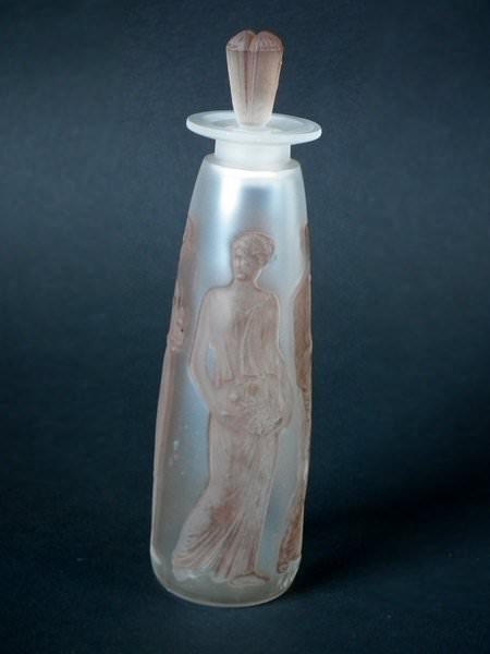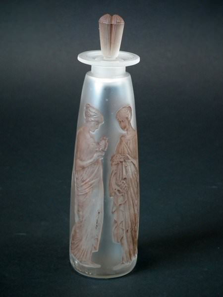 Rene Lalique clear & frosted, sepia stained glass perfume bottle.'Ambre antique' design.