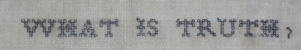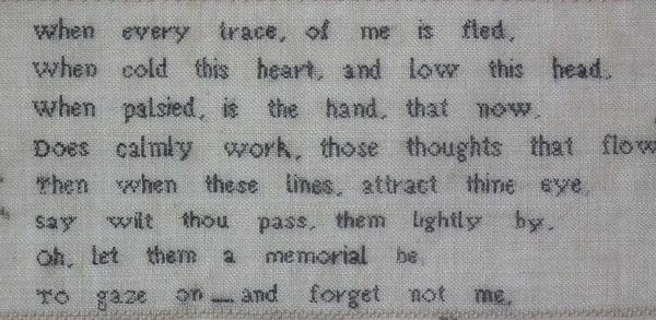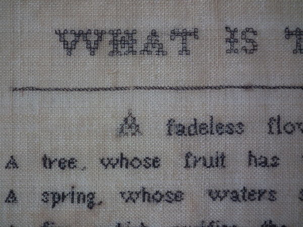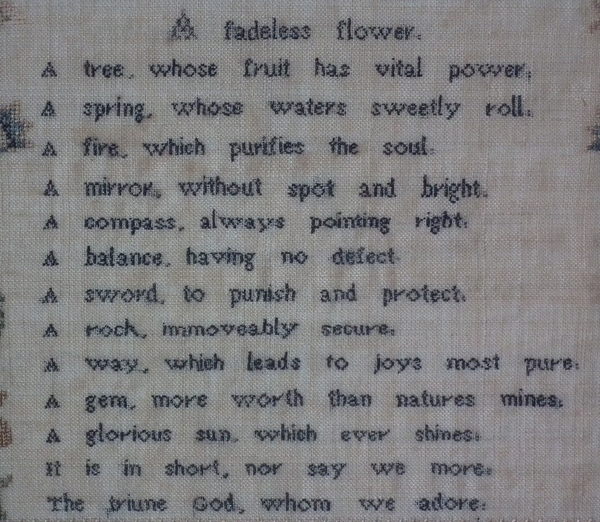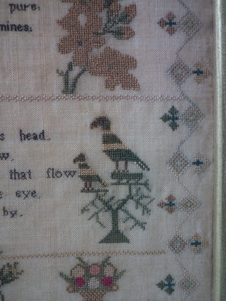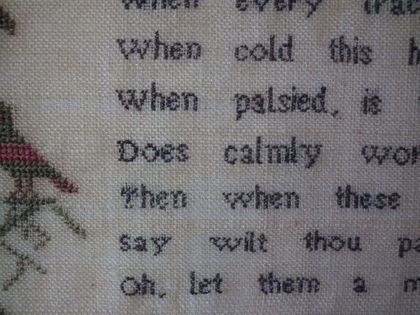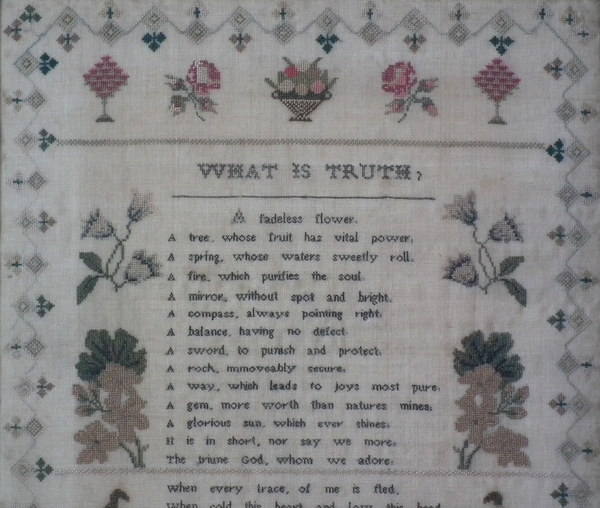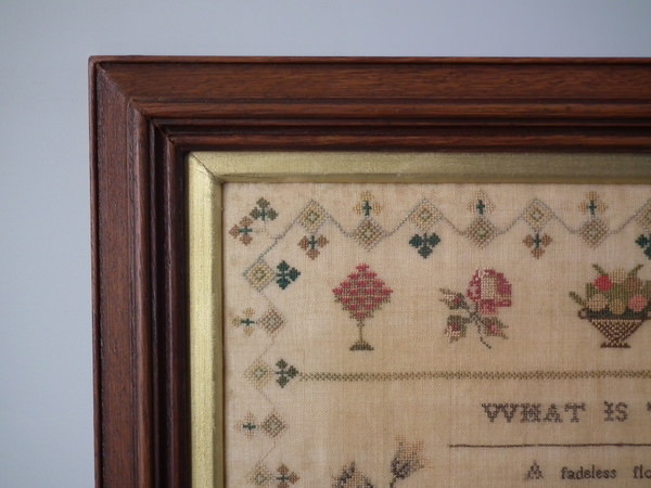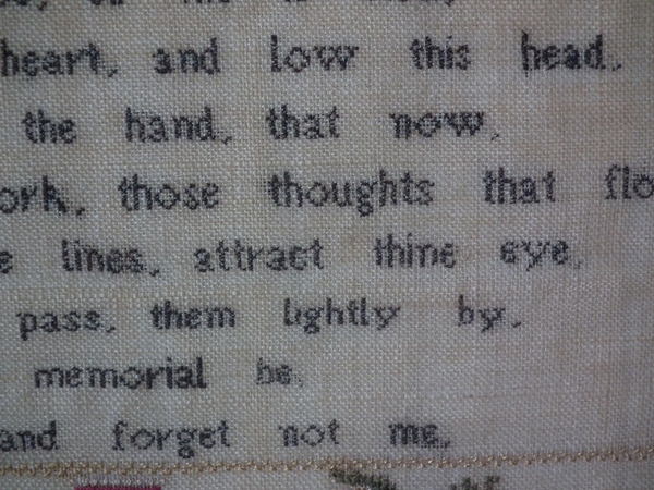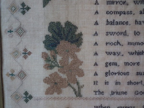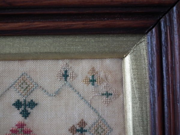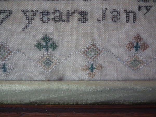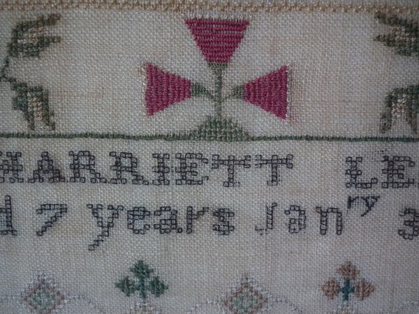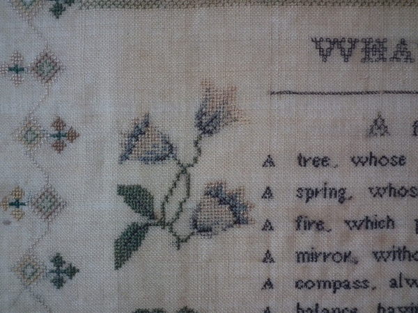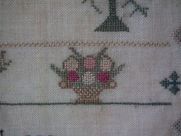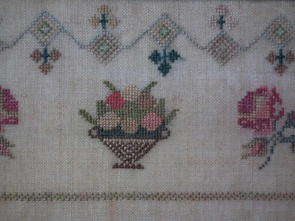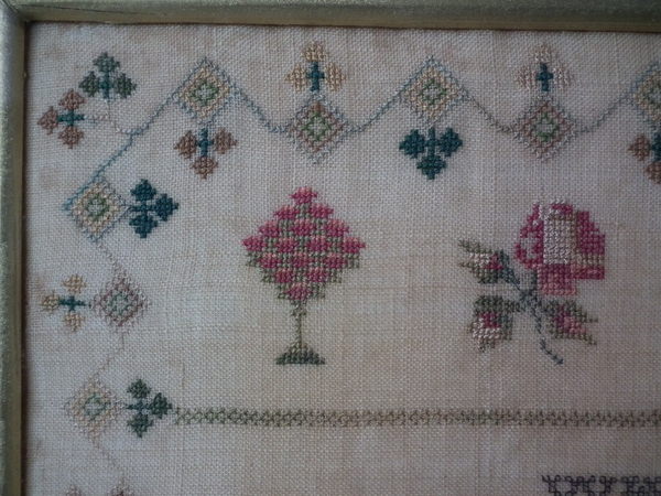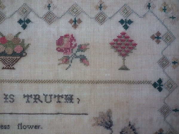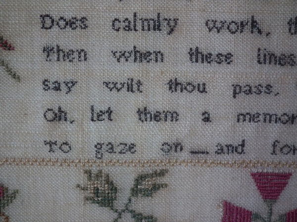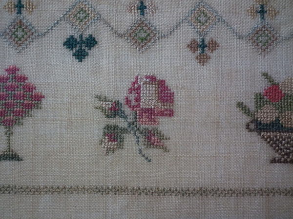 The sampler is worked in silk on linen ground, in cross stitch throughout.